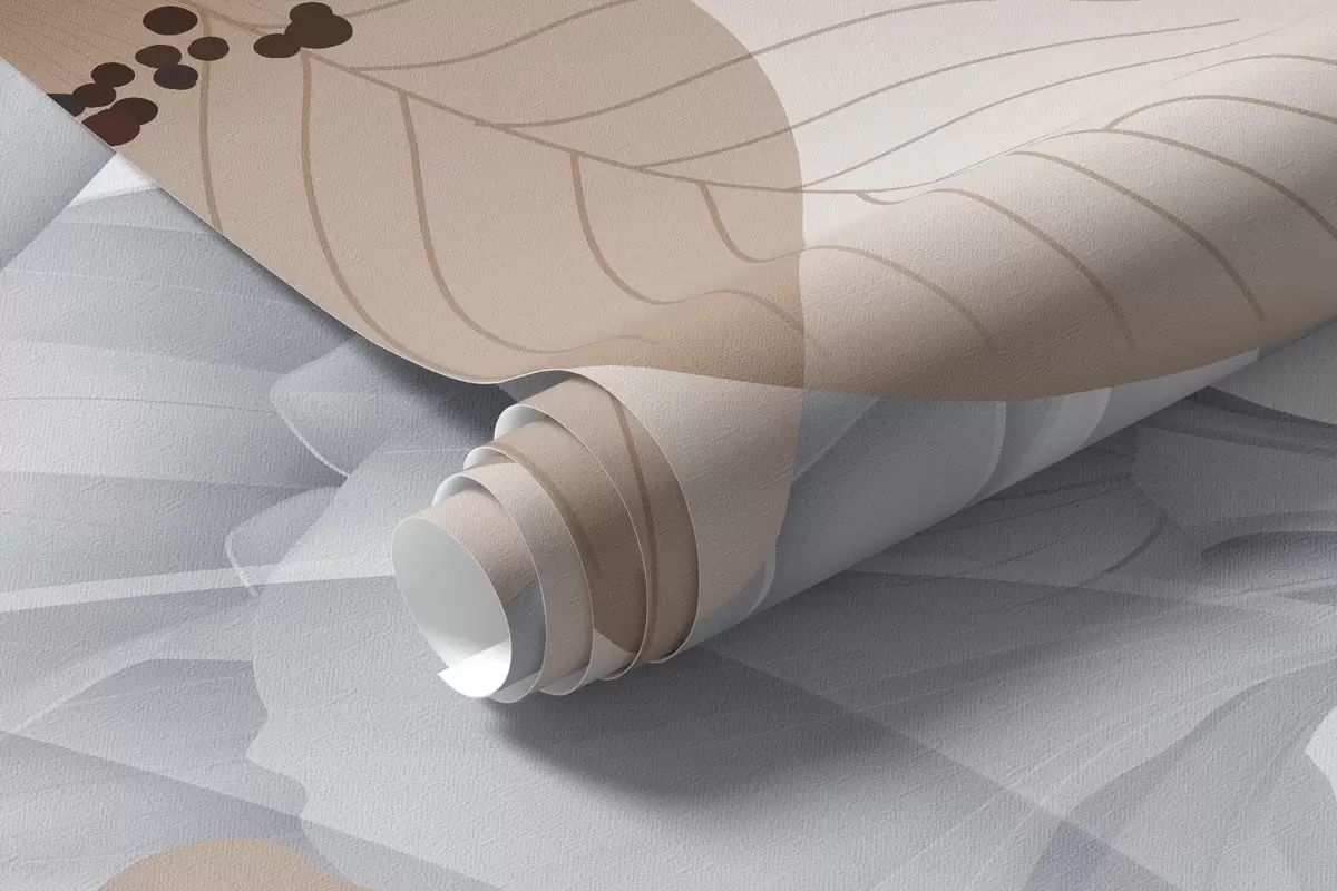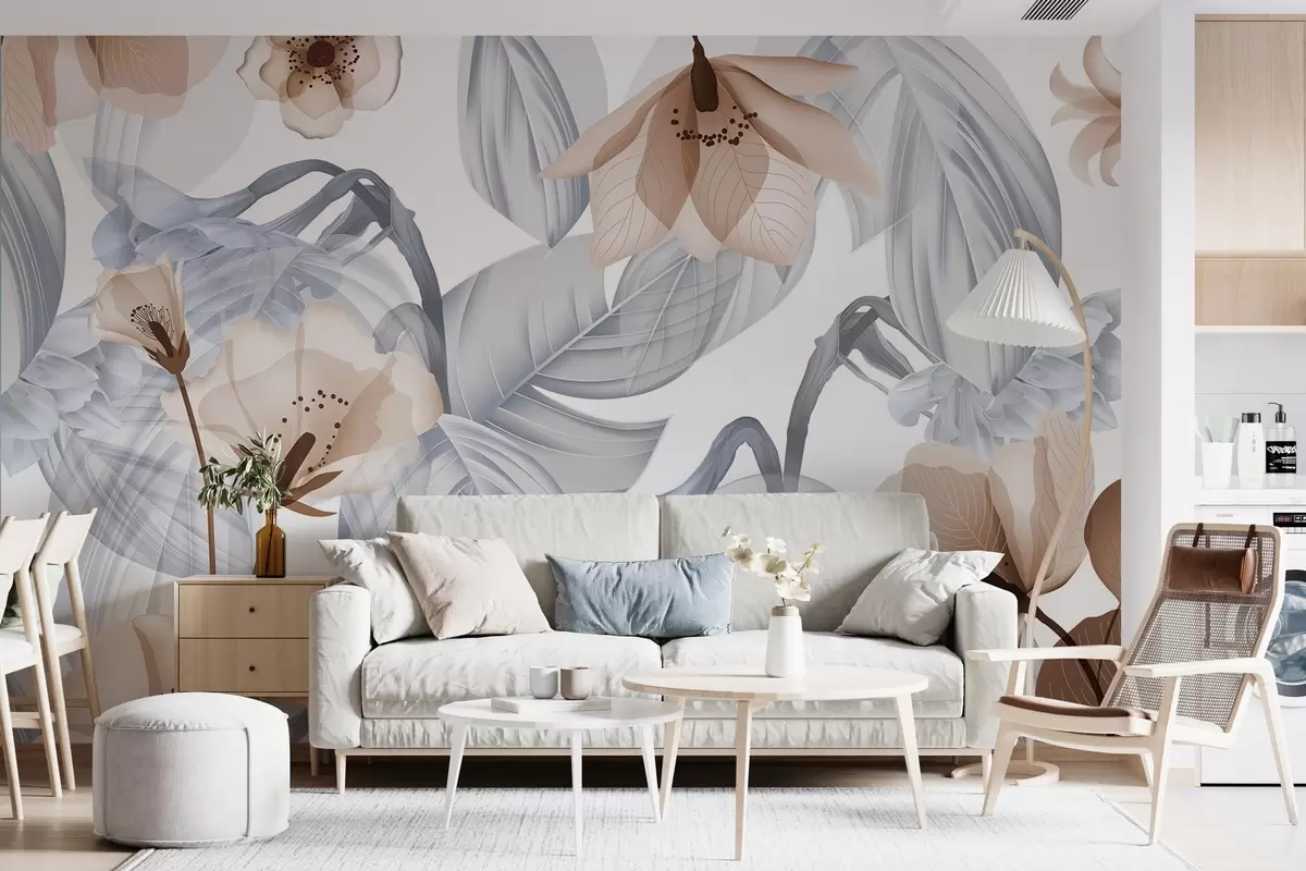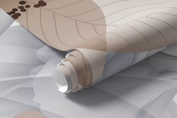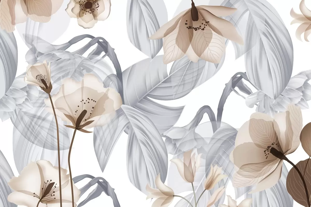 Fototapeta Brązowe kwiaty i szare liście, kwiatowe tło botaniczne, elegancki wzór, delikatne kolory, lekkie, subtelne detale Nr w09497v1