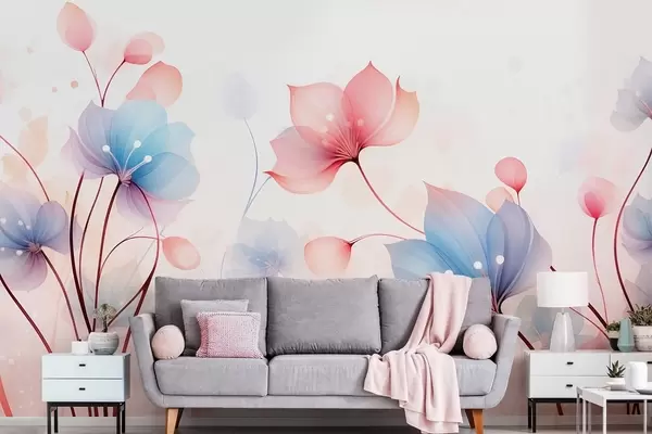 Fototapeta Delikatne różowo-niebieskie kwiaty — zwiewna flora na białym tle akwareli Nr w09507