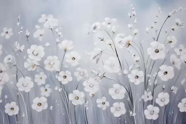 Fototapeta Białe kwiaty na tle niebieskich gór i jeziora w stylu malarstwa olejnego Nr w09516