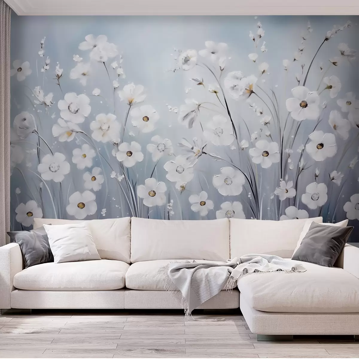 Fototapeta Białe kwiaty na tle błękitnego nieba w stylu malarstwa olejnego Nr w09516