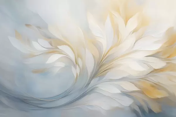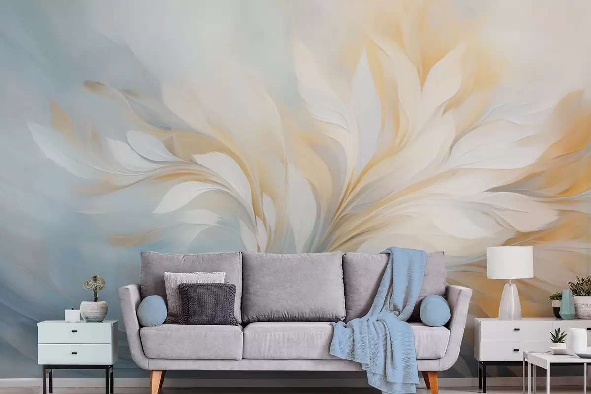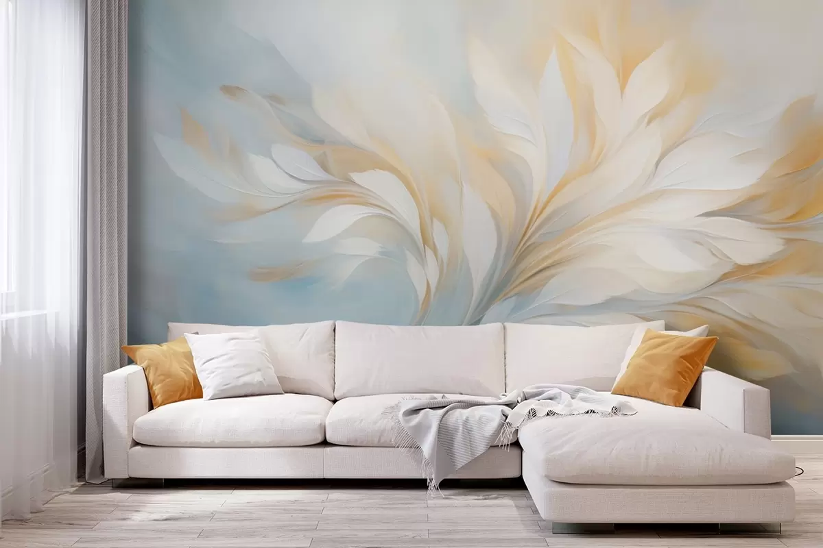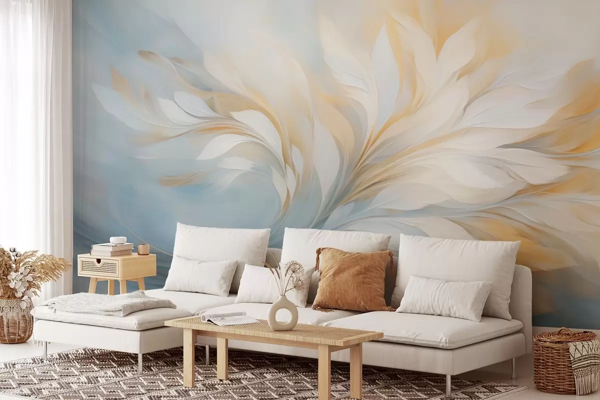 Fototapeta Abstrakcyjna kompozycja gładkich form przypominających pióra w odcieniach żółci i błękitu. Nr w09525