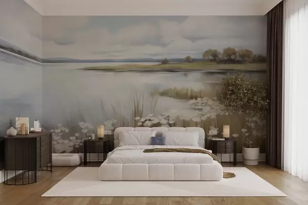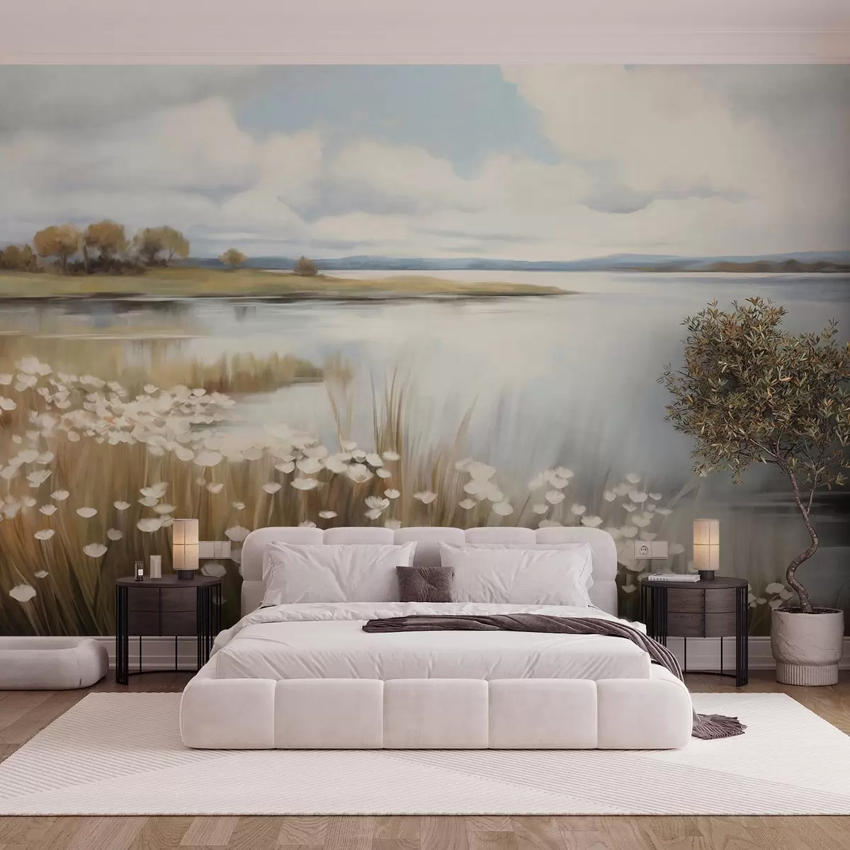 Fototapeta Teksturowany krajobraz, pole białych kwiatów i wysokiej trawy, jezioro w tle, trawiaste wzgórze z drzewami, delikatne kolory Nr w09530