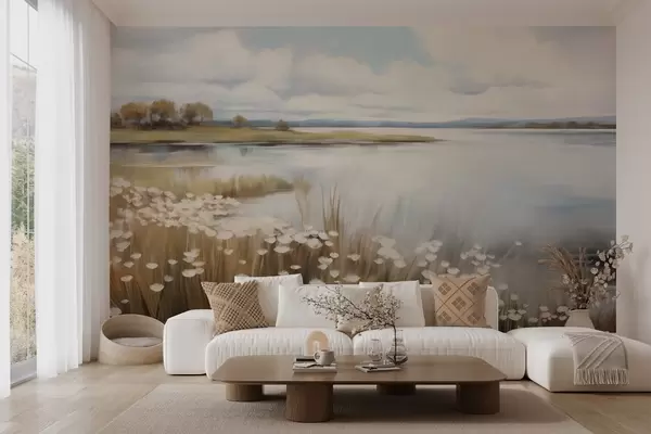 Fototapeta Teksturowany krajobraz, pole białych kwiatów i wysokiej trawy, jezioro w tle, trawiaste wzgórze z drzewami, delikatne kolory Nr w09530