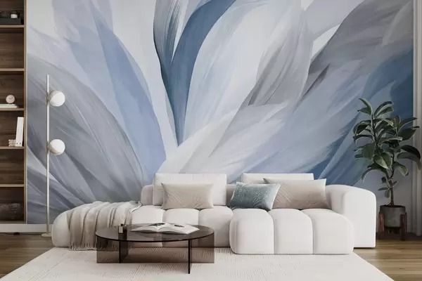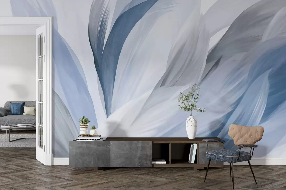 Fototapeta Abstrakcyjne teksturowane pióra w kolorach niebieskim, białym i szarym oraz różnych odcieniach, nakładające się na białe tło. Nr w09531v1