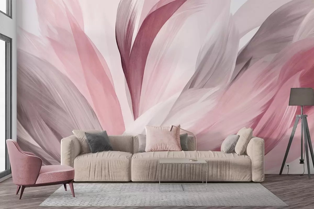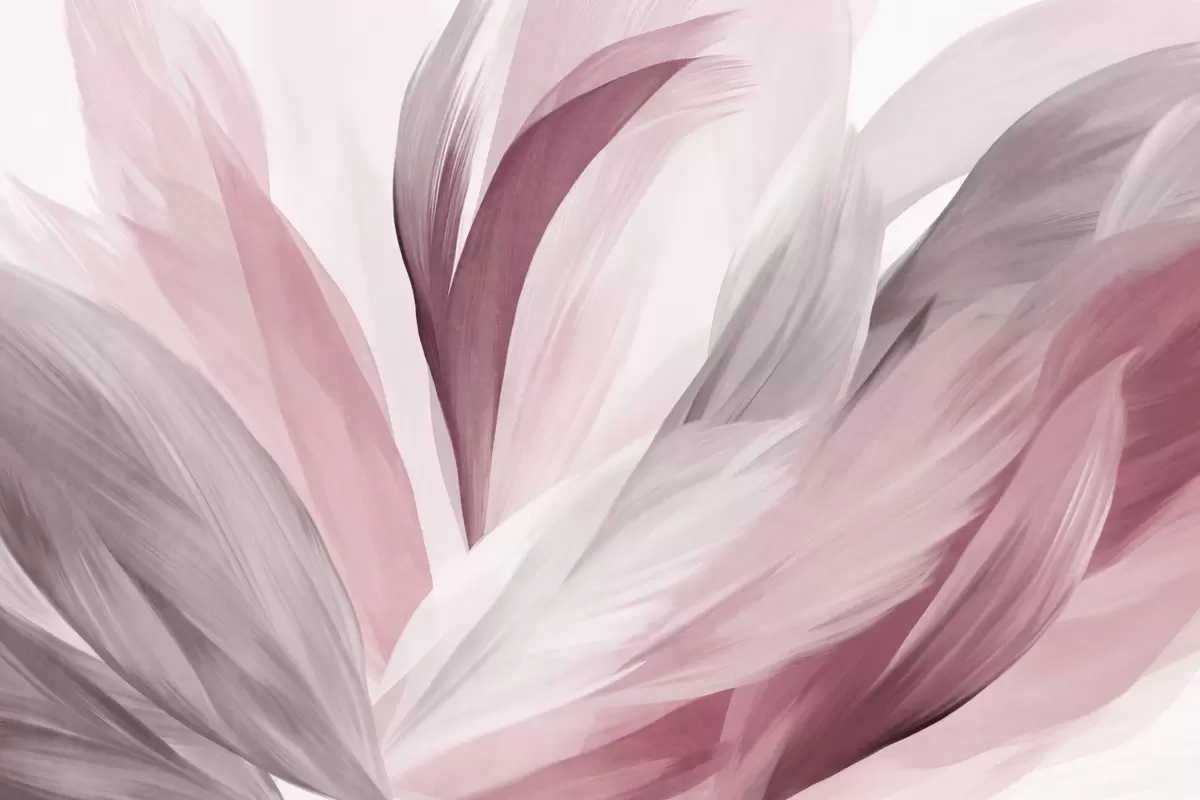 Fototapeta Abstrakcyjne teksturowane pióra w kolorze różowym, białym i szarym oraz różnych odcieniach, nakładające się na białe tło. Nr w09531v2