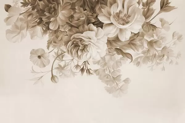 Fototapeta Klasyczna kompozycja kwiatowa z różami, piwoniami i innymi teksturowanymi kwiatami z liśćmi, na jasnym tle Nr w09532