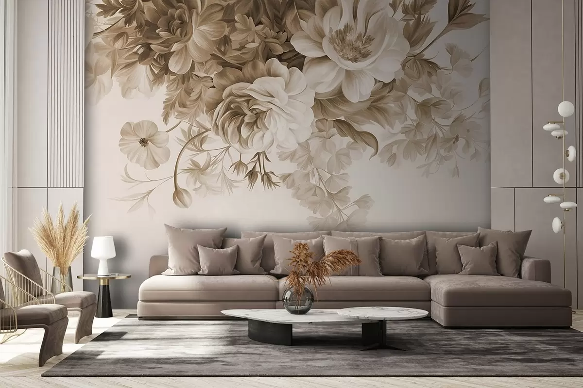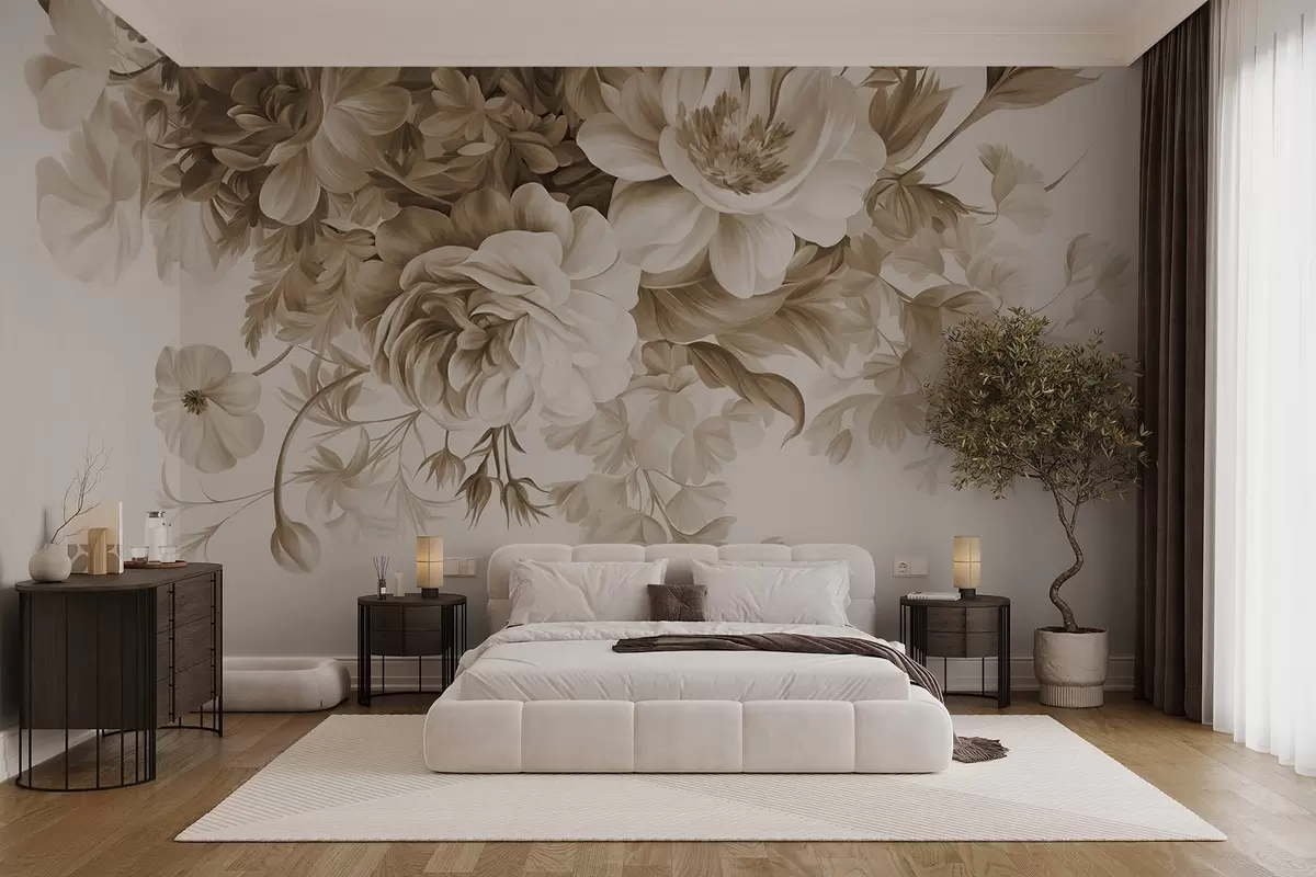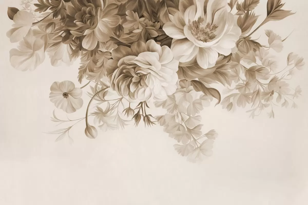 Fototapeta Klasyczna kompozycja kwiatowa z różami, piwoniami i innymi teksturowanymi kwiatami z liśćmi, na jasnym tle Nr w09532v1