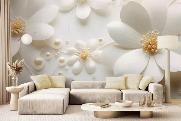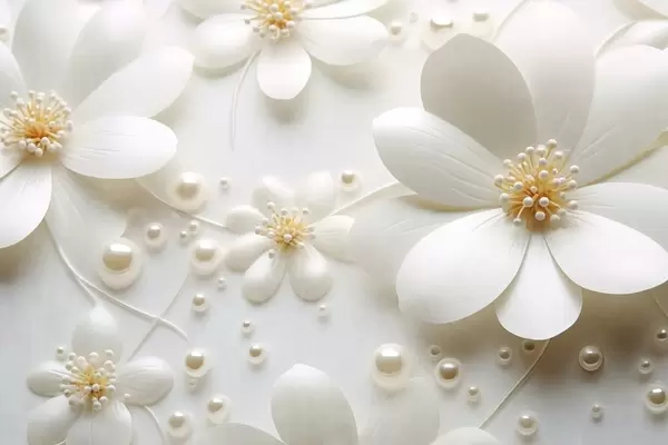 Fototapeta Białe kwiaty z perełkami rozrzuconymi na białym tle, elegancki i minimalistyczny wzór, teksturowany Nr w09535