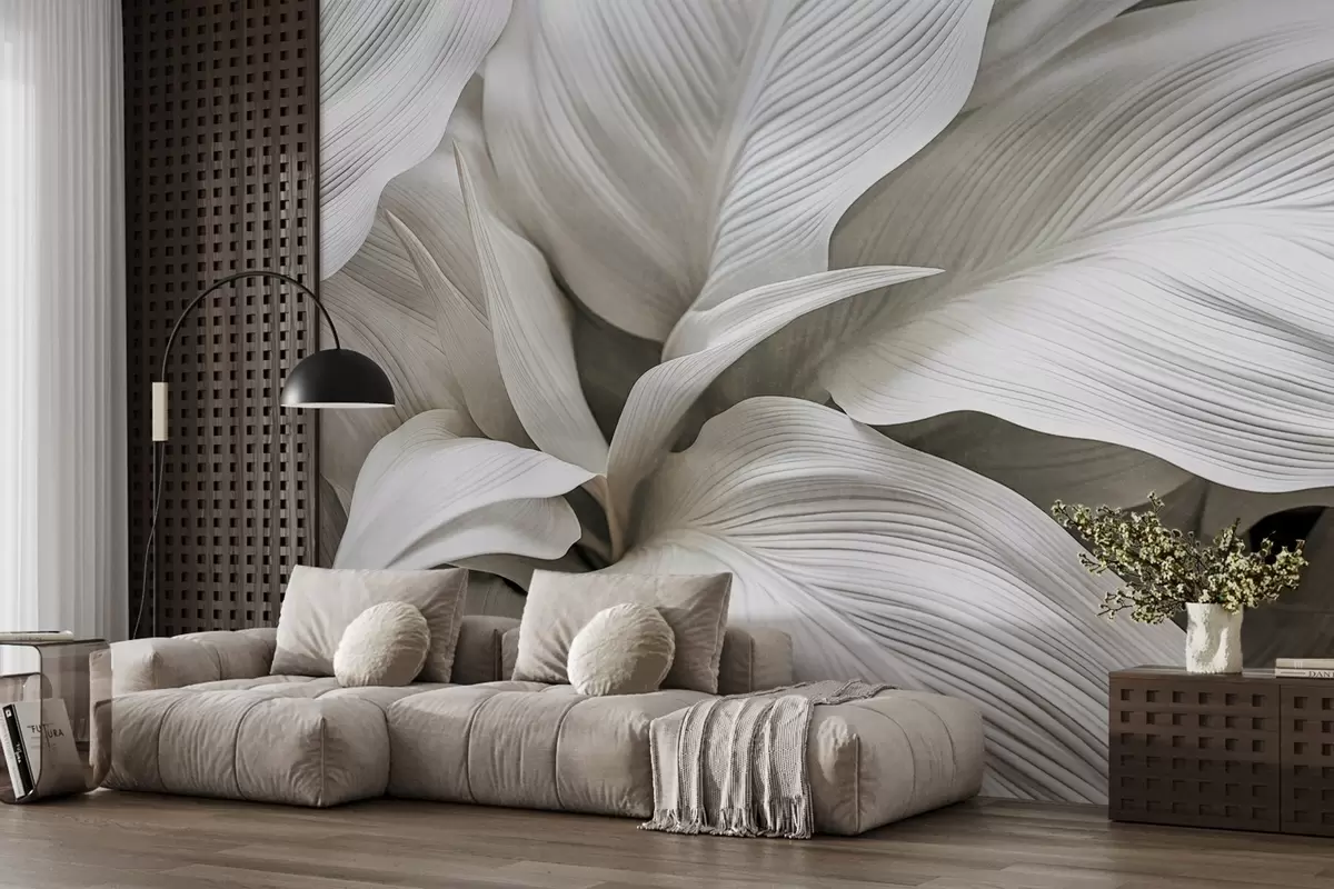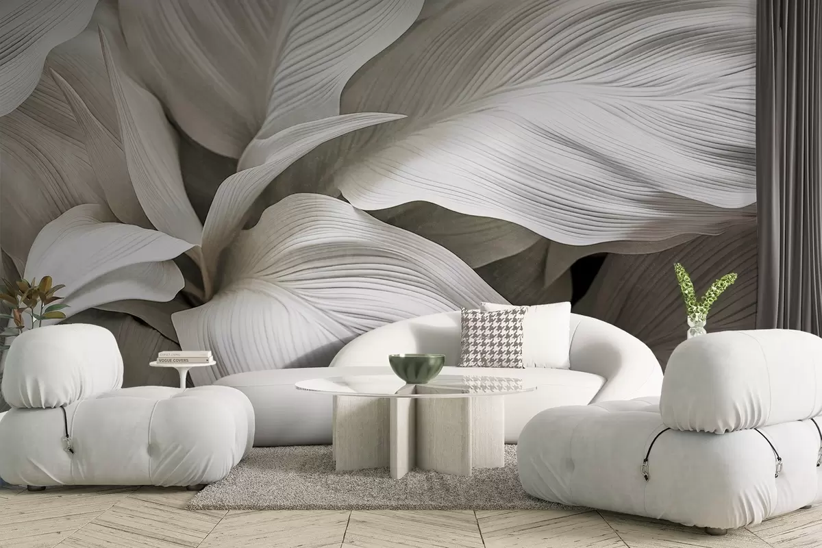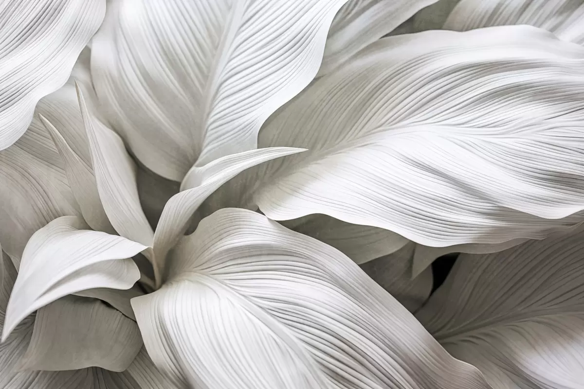 Fototapeta Duże, teksturowane białe liście z wyraźnymi żyłkami, nakładające się na siebie i tworzące głębię Nr w09536