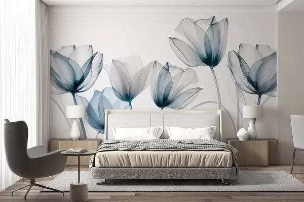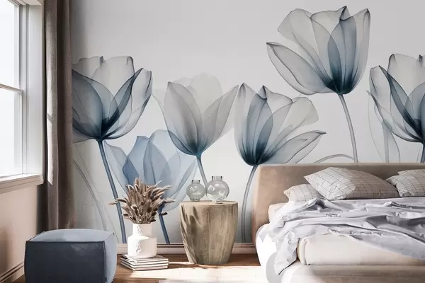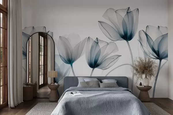 Fototapeta Przezroczyste niebiesko-białe tulipany o długich łodygach na jasnym tle, delikatna i teksturowana sztuka kwiatowa. Nr w09538