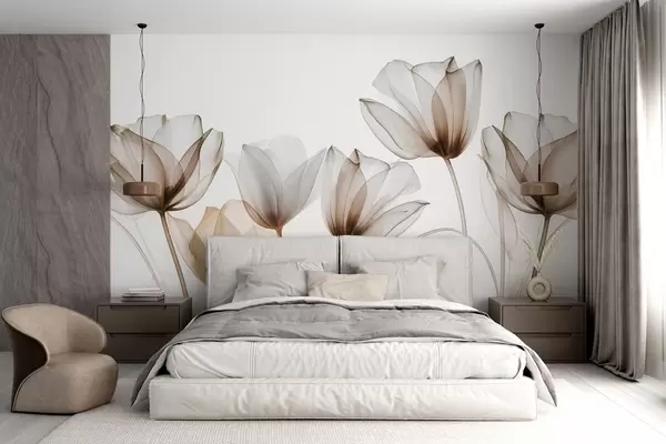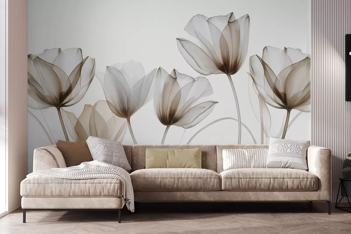 Fototapeta Przezroczyste brązowo-białe tulipany o długich łodygach na jasnym tle, delikatna i teksturowana kompozycja kwiatowa. Nr w09538v1