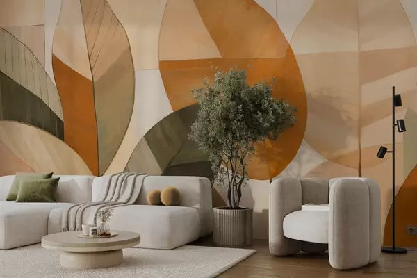 Fototapeta Abstrakcyjne duże liście w odcieniach pomarańczowego, brązowego i zielonego, teksturowane, ułożone na jasnym tle. Nr w09539