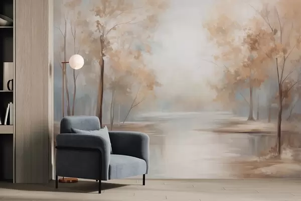 Fototapeta Jesienny krajobraz z drzewami i rzeką, delikatnymi kolorami, lekką i przestronną atmosferą, spokojną i cichą sceną. Nr w09541