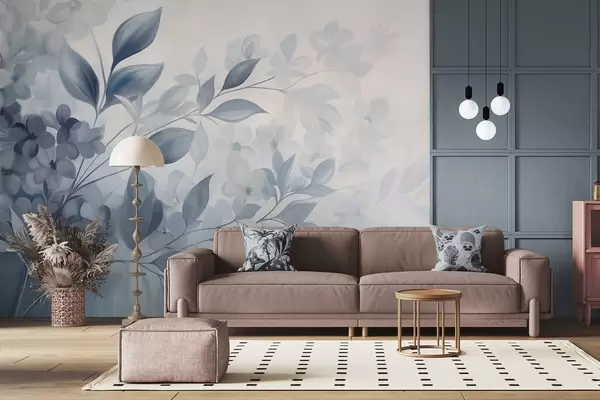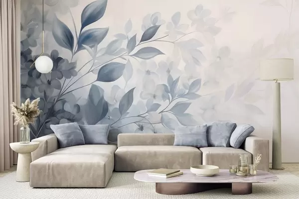 Fototapeta Teksturowana niebiesko-biała gałąź z kwiatami i liśćmi, przechodząca w jasne tło w stylu akwareli. Nr w09543