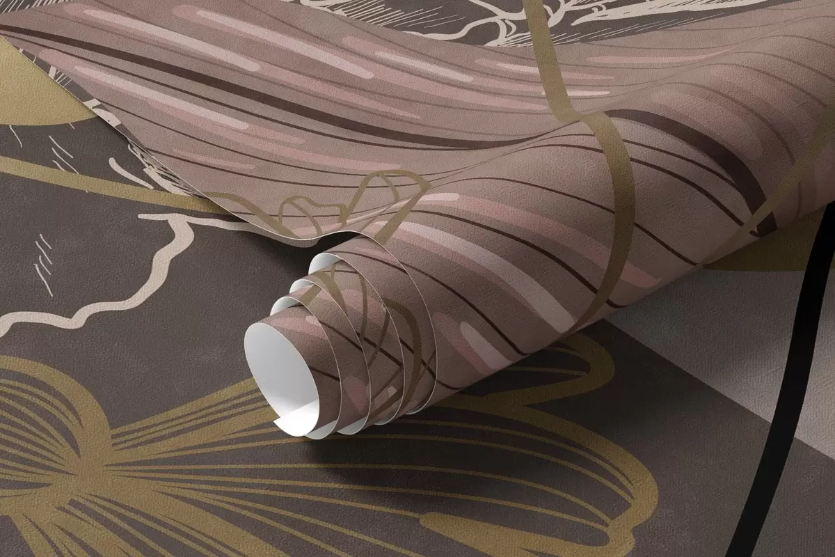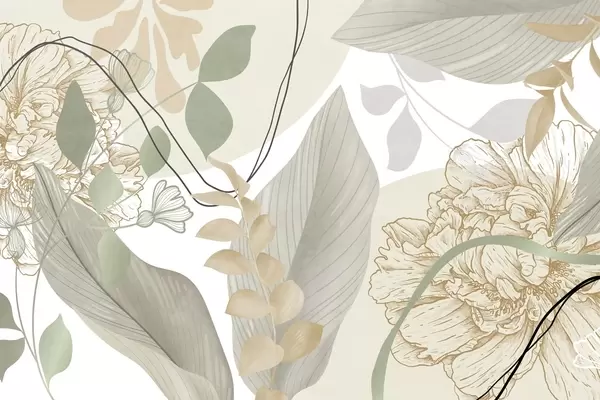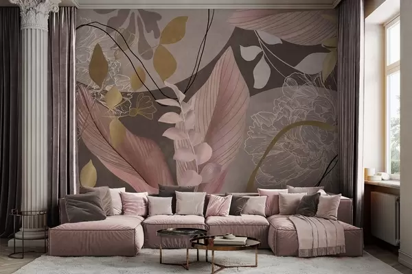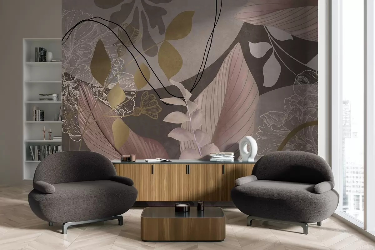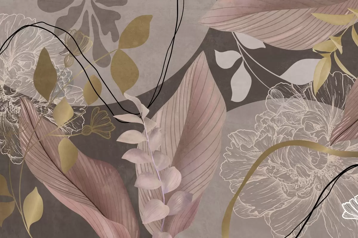 Fototapeta Abstrakcyjny kwiatowy wzór z dużymi liśćmi w odcieniach stonowanego różu i brązu, z cienkimi czarnymi liniami i białymi konturami kwiatów. Nr w09544