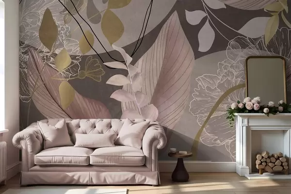 Fototapeta Abstrakcyjny kwiatowy wzór z dużymi liśćmi w odcieniach stonowanego różu i brązu, z cienkimi czarnymi liniami i białymi konturami kwiatów. Nr w09544