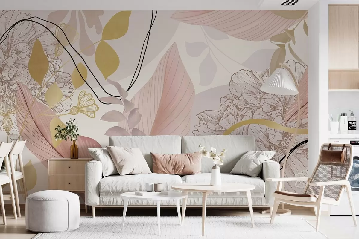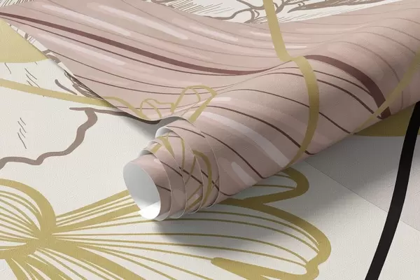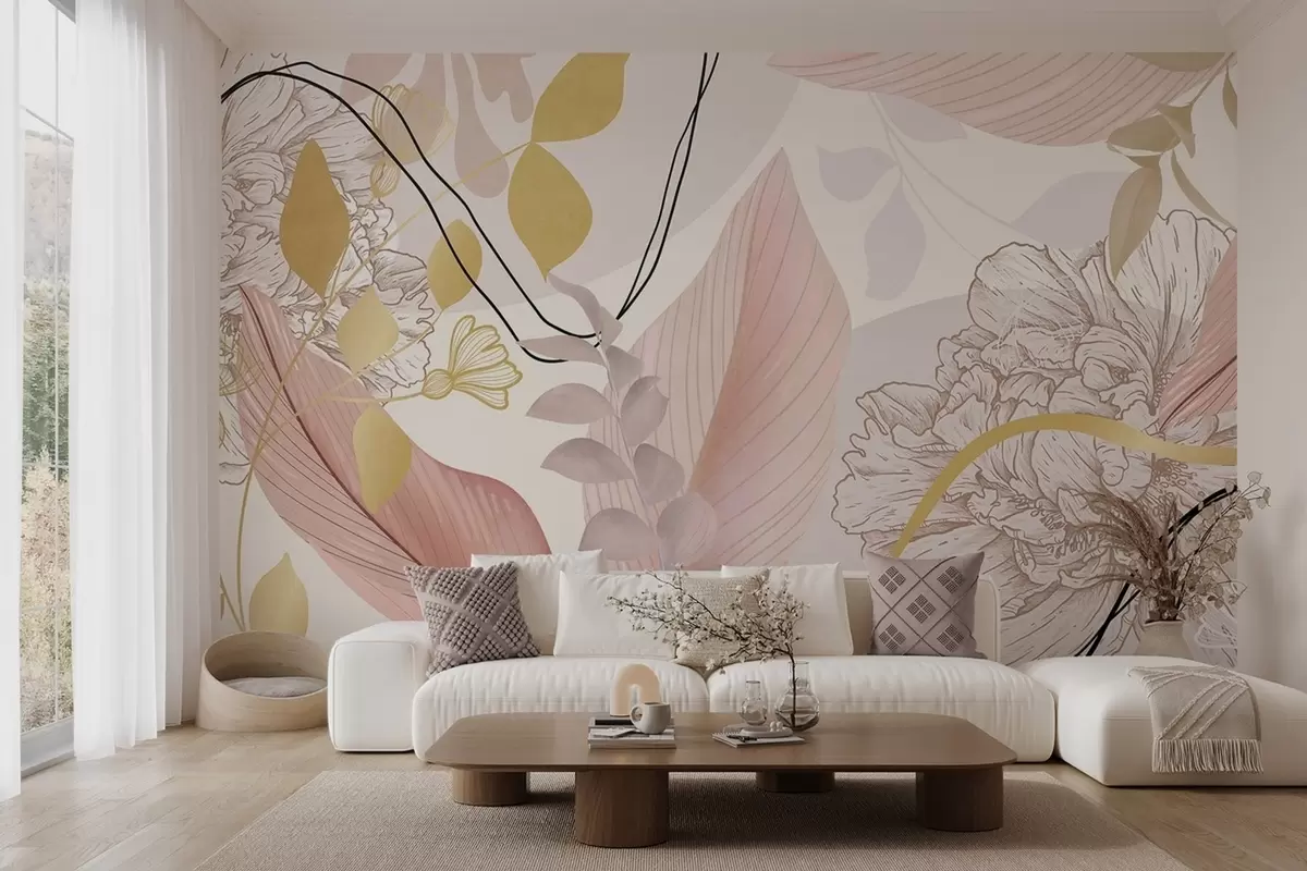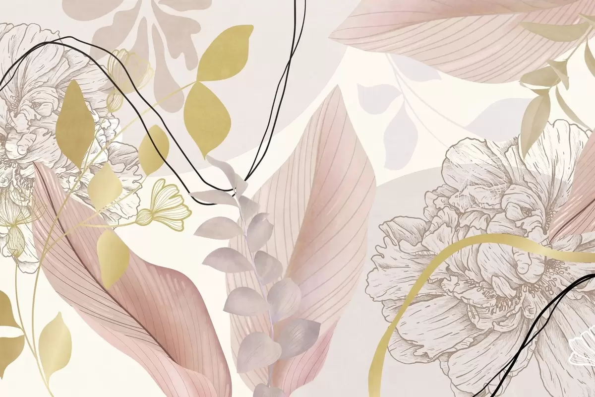 Fototapeta Abstrakcyjny kwiatowy wzór z dużymi liśćmi w odcieniach stonowanego różu, żółci z cienkimi czarnymi liniami i białymi konturami kwiatów. Nr w09544v1