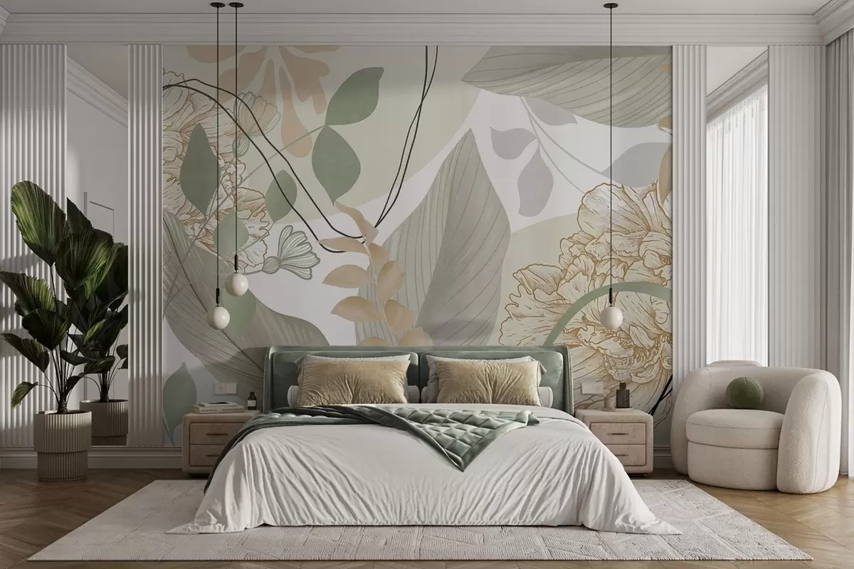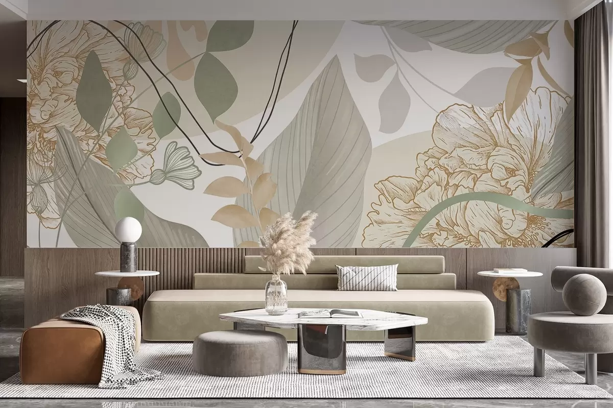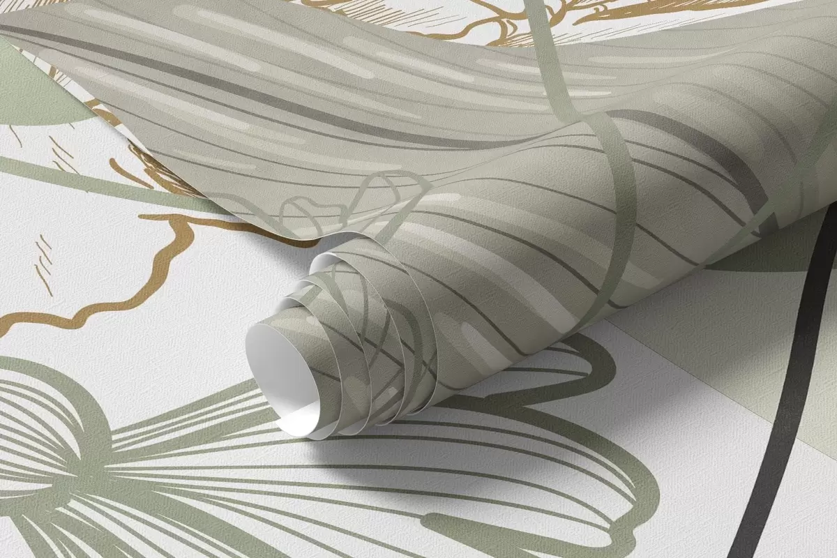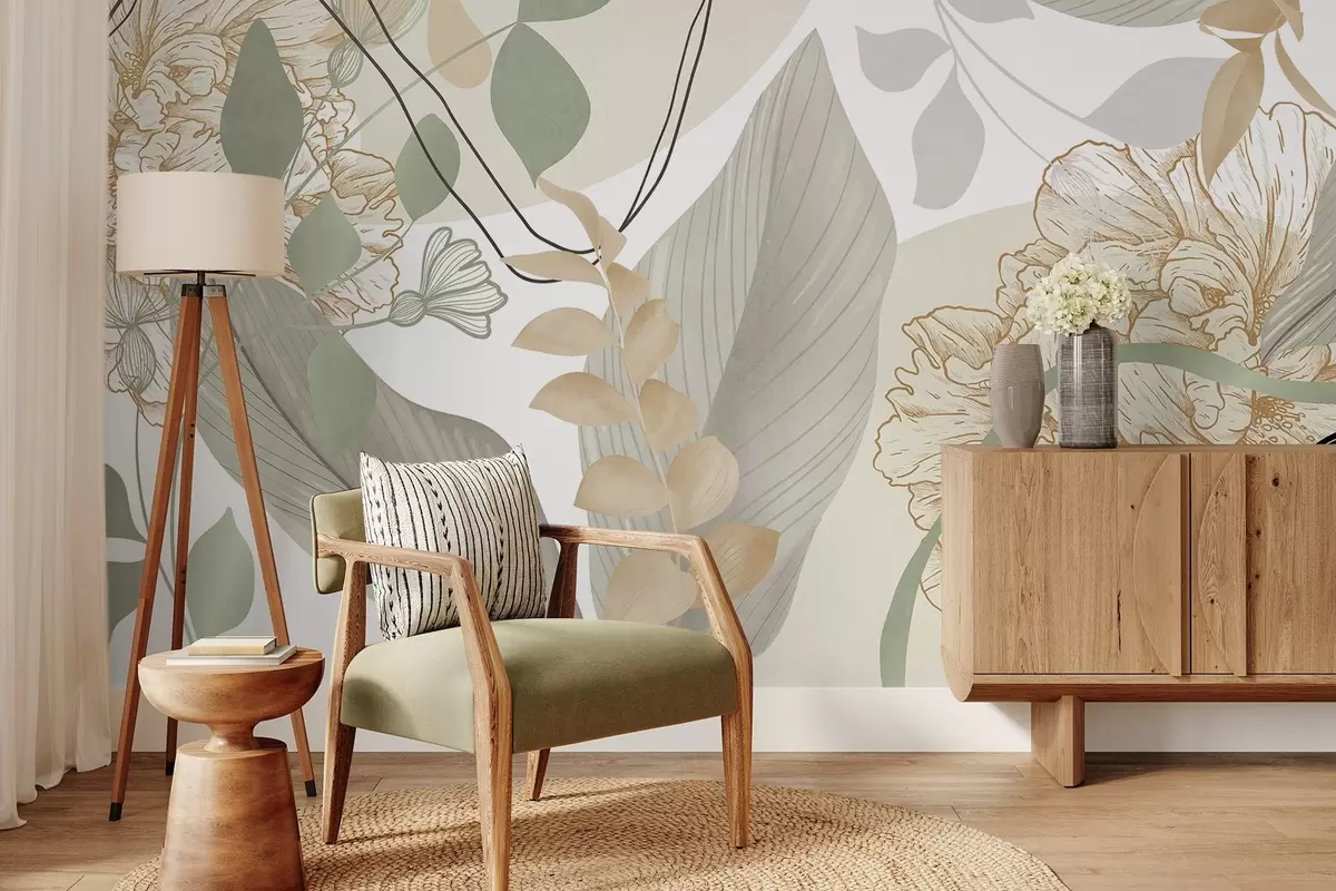 Fototapeta Abstrakcyjny kwiatowy wzór z dużymi liśćmi w stonowanych odcieniach zieleni i żółci, z cienkimi czarnymi liniami i białymi konturami kwiatów. Nr w09544v2