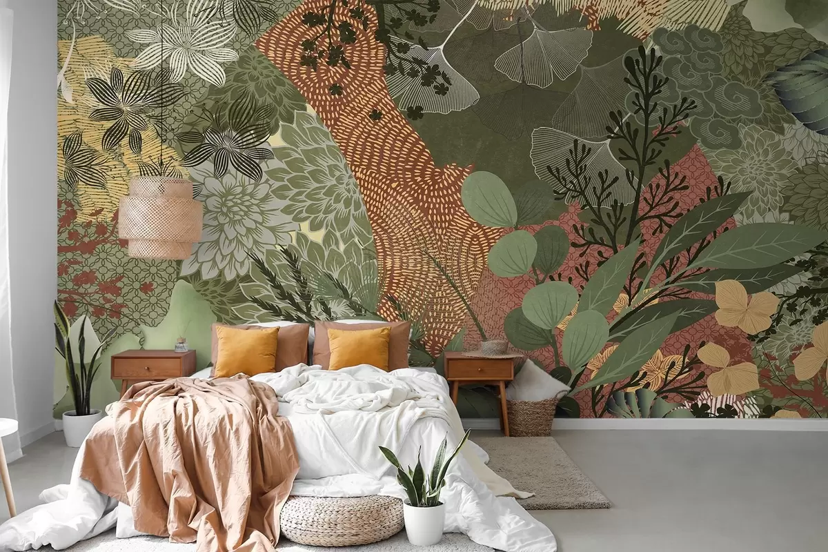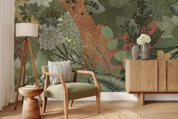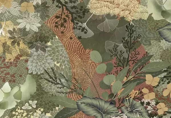 Fototapeta Abstrakcyjny kolaż z elementami botanicznymi, liśćmi, kwiatami i organicznymi teksturami w odcieniach zieleni i brązu. Nr w09545