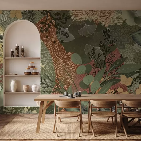 Fototapeta Abstrakcyjny kolaż z elementami botanicznymi, liśćmi, kwiatami i organicznymi teksturami w odcieniach zieleni i brązu Nr w09545