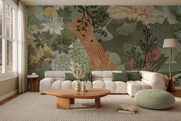 Fototapeta Abstrakcyjny kolaż z elementami botanicznymi, liśćmi, kwiatami i organicznymi teksturami w odcieniach zieleni i brązu. Nr w09545