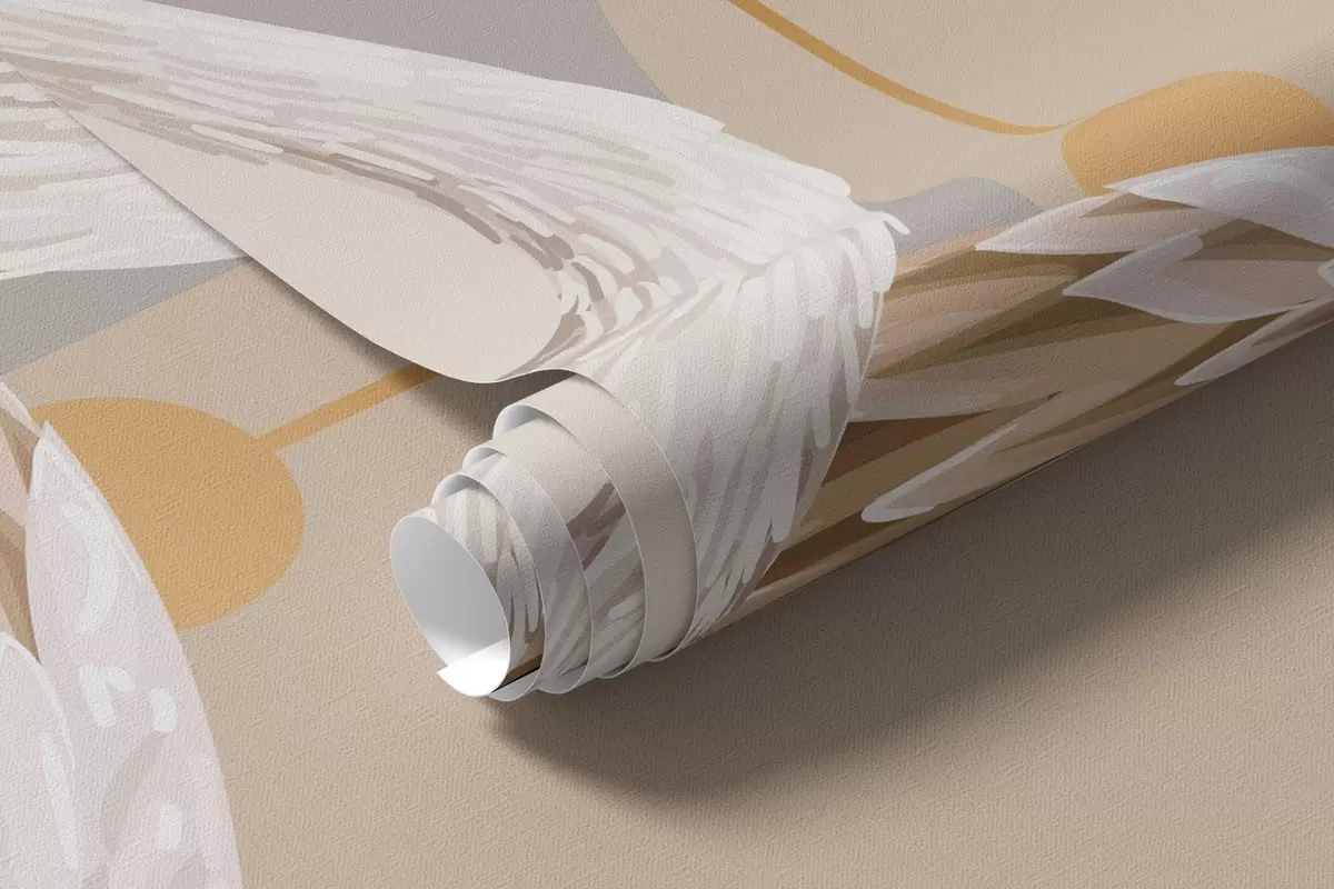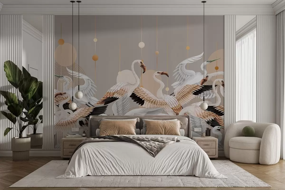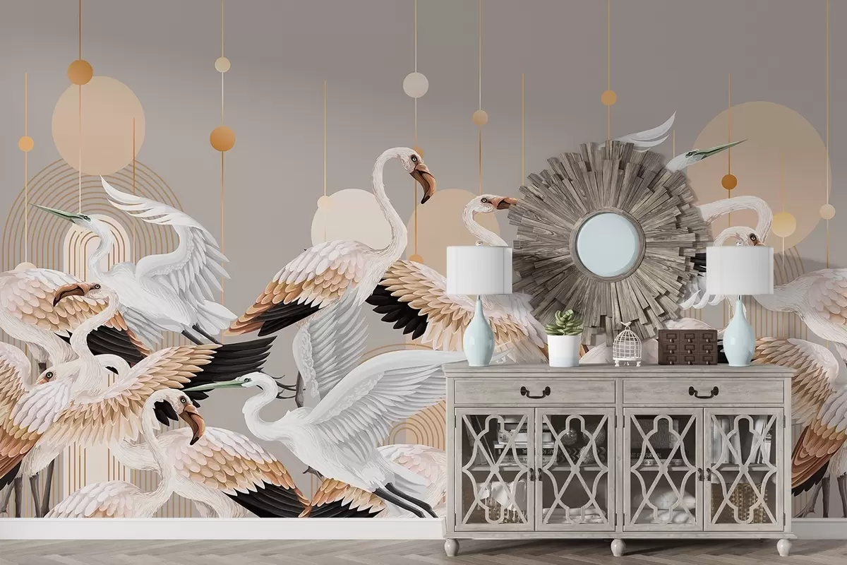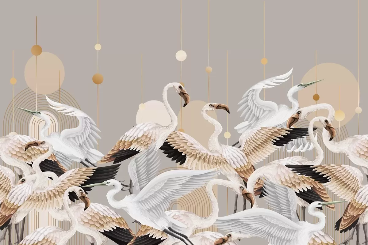 Fototapeta Stado białych flamingów o delikatnych skrzydłach na neutralnym tle z żółtymi liniami i okręgami. Nr w09546v1