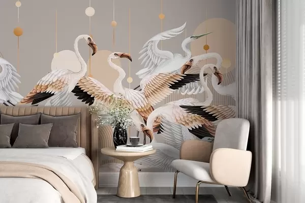 Fototapeta Stado białych flamingów o delikatnych skrzydłach na neutralnym tle z żółtymi liniami i okręgami Nr w09546v1