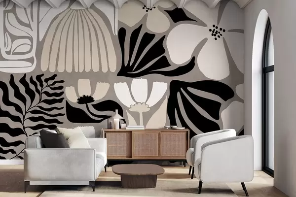Fototapeta Nowoczesne, minimalistyczne stylizowane kwiaty i liście w kolorach beżowym, czarnym i białym, z teksturą na szarym tle. Nr w09547