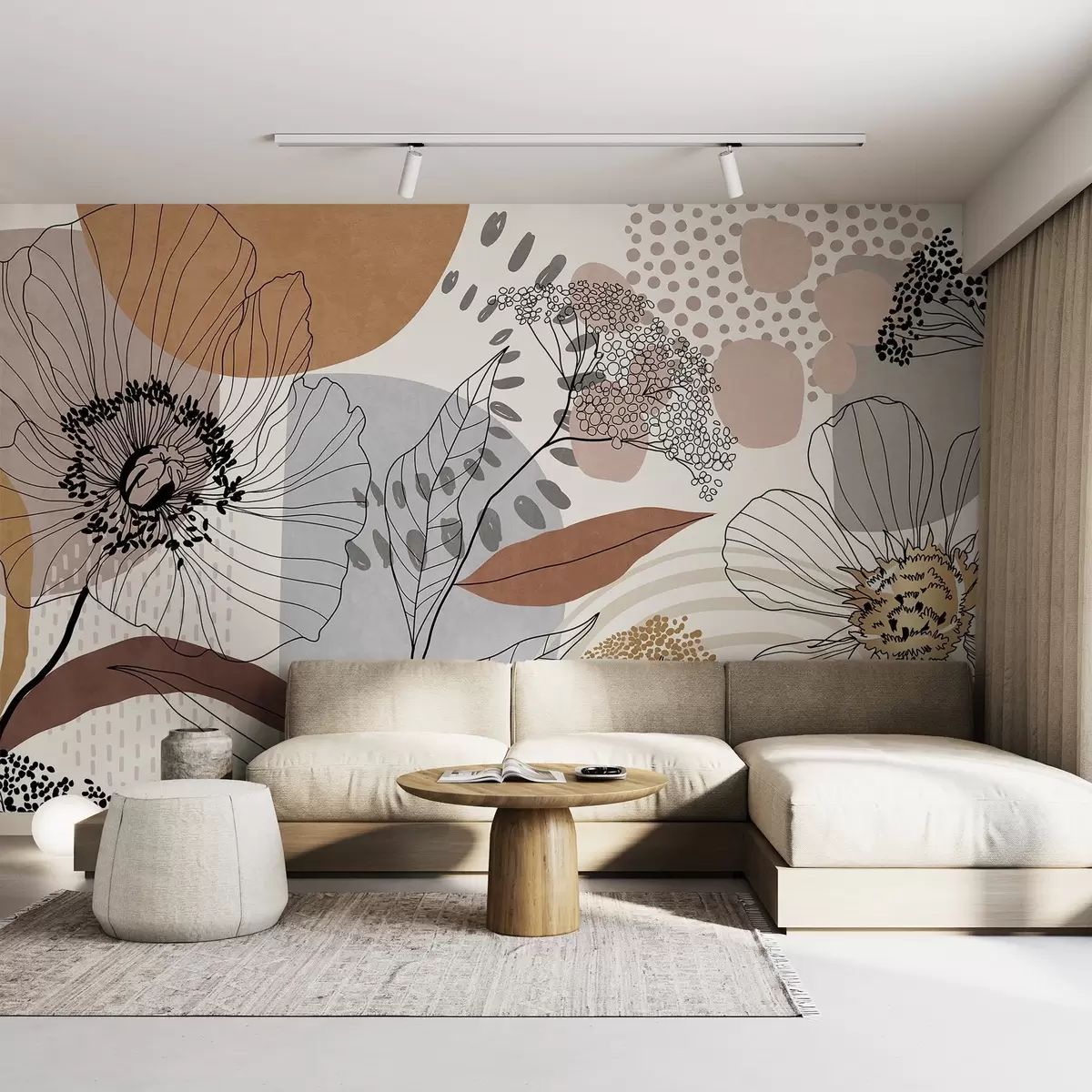Fototapeta Abstrakcyjny kwiatowy wzór z liniowymi kwiatami, liśćmi i organicznymi kształtami w stonowanych odcieniach brązu, beżu i szarości. Nr w09548