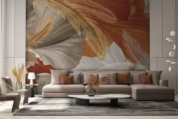 Fototapeta Abstrakcyjne, teksturowane, duże, płynne kształty w kolorach kremowym i rdzawym z delikatnymi, żółtymi, beżowymi i brązowymi piórami. Nr w09549