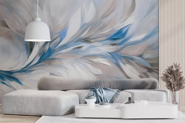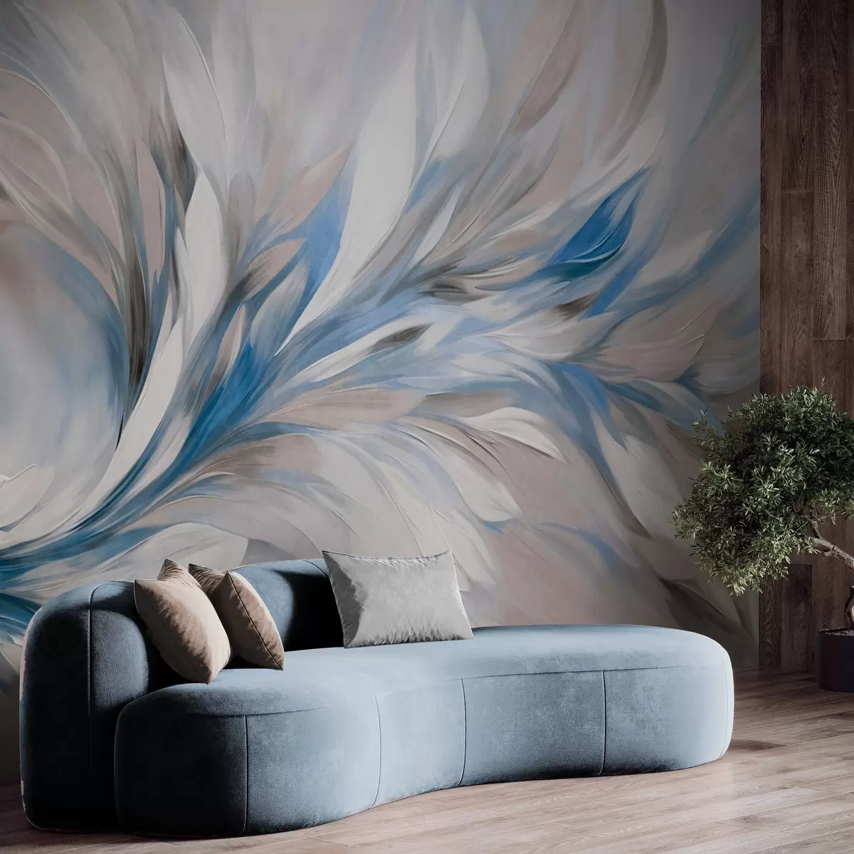 Fototapeta Styl malarstwa abstrakcyjnego z białymi, niebieskimi i szarymi teksturowanymi pociągnięciami pędzla na delikatnym, jasnym tle. Nr w09552v1