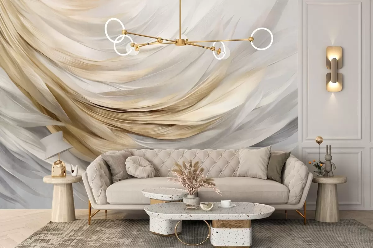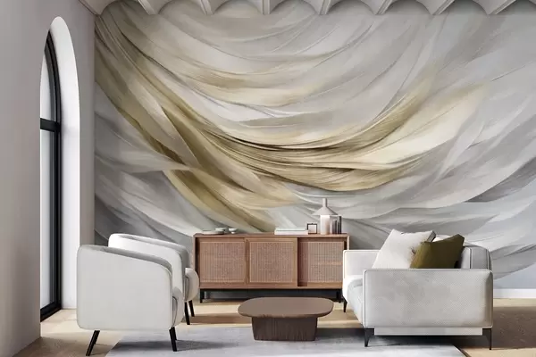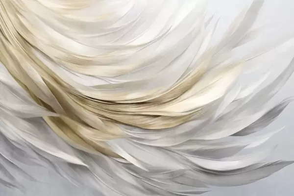 Fototapeta Abstrakcyjne teksturowane białe, szare i żółte pióra, tworzące płynny, warstwowy wzór na jasnym tle. Nr w09557