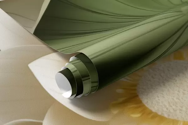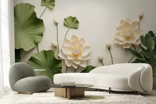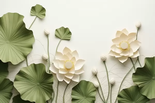 Fototapeta Trójwymiarowe kwiaty lotosu z zielonymi teksturowanymi liśćmi, styl minimalistyczny Nr w09560
