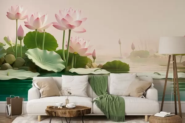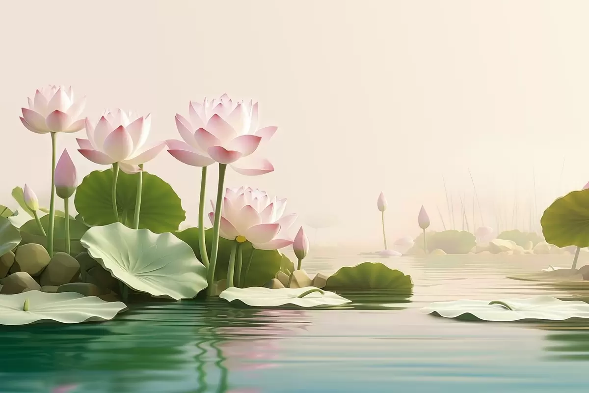 Fototapeta Różowe kwiaty lotosu na wodzie, spokojny tropikalny krajobraz Nr w09561