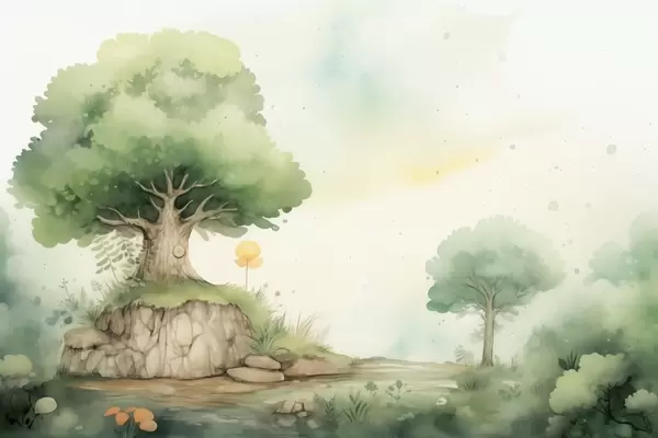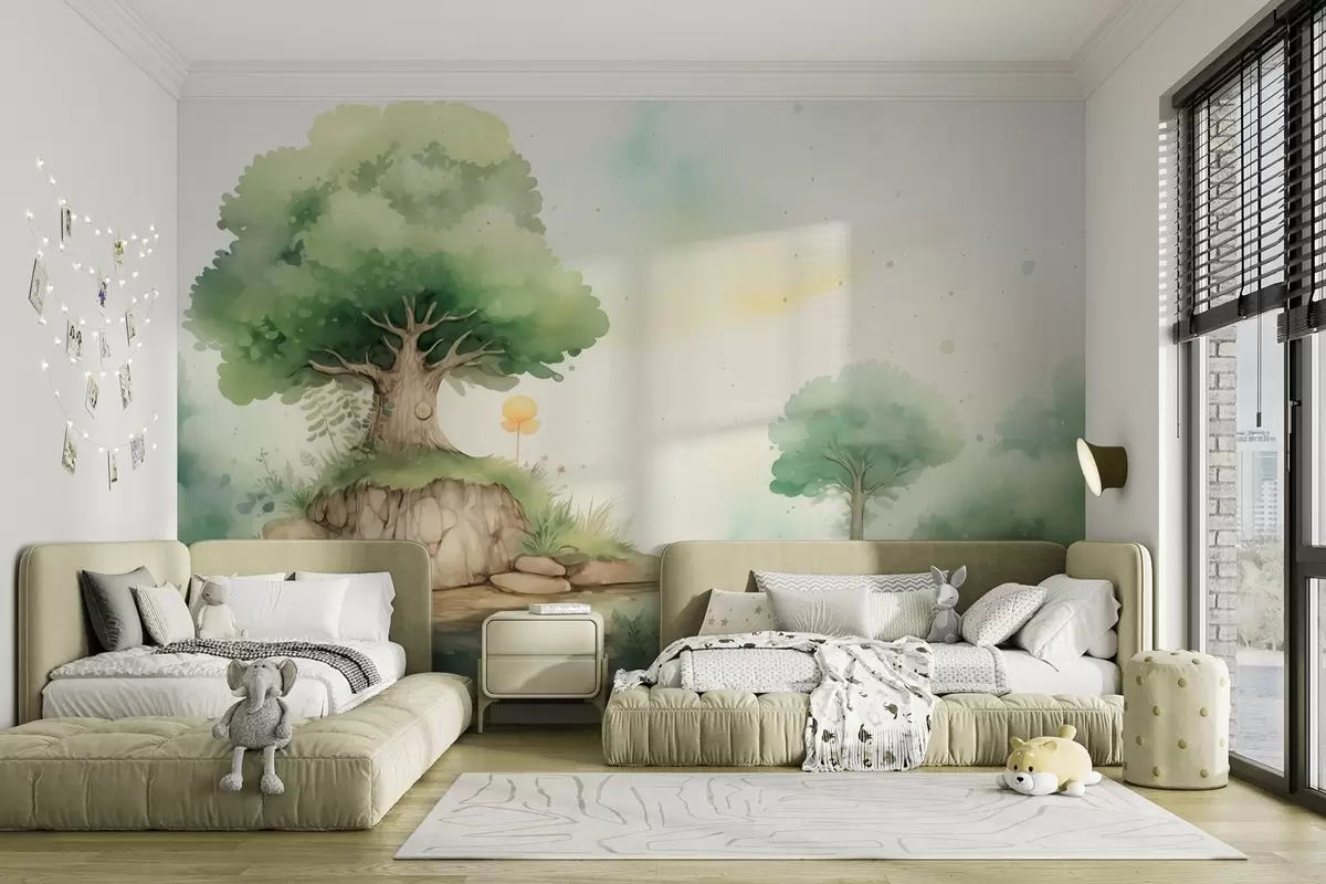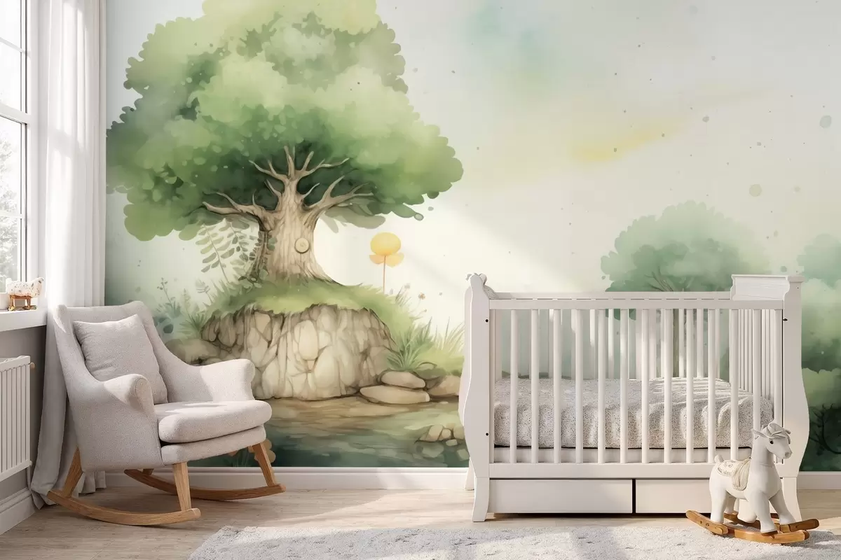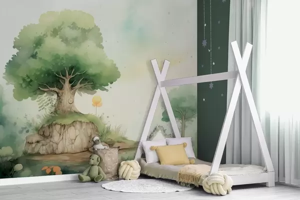 Fototapeta Bajkowy świat dzieciństwa w zielonym lesie, styl akwarelowy Nr w09566
