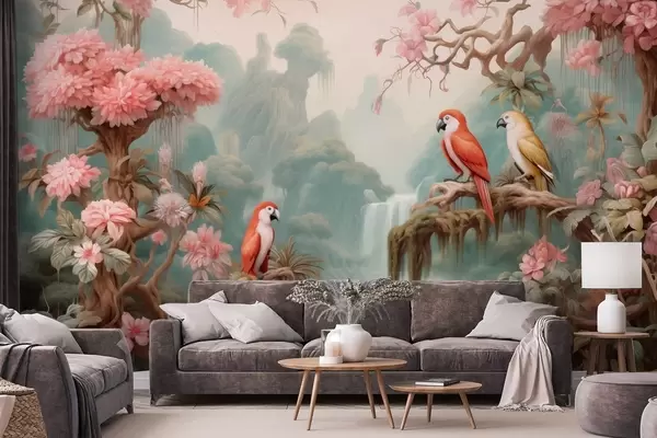 Fototapeta Bajkowy las tropikalny z papugami, kwitnącymi drzewami o różowych kwiatach i wodospadem. Nr w09580