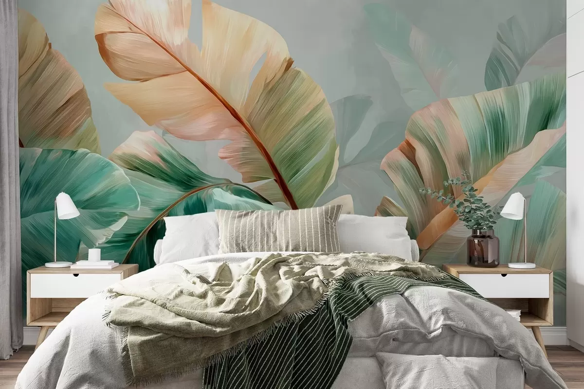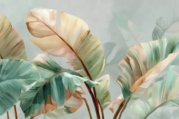 Fototapeta Delikatne tropikalne liście bananowca w pastelowych odcieniach żółto-zielonym Nr w09581
