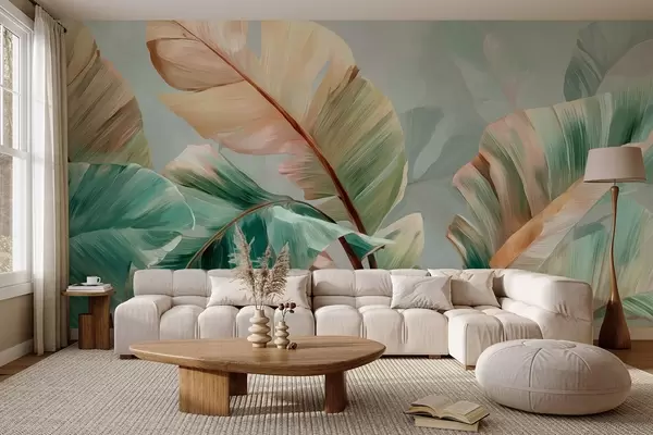 Fototapeta Delikatne tropikalne liście bananowca w pastelowych odcieniach żółto-zielonym Nr w09581