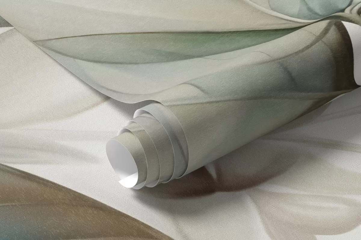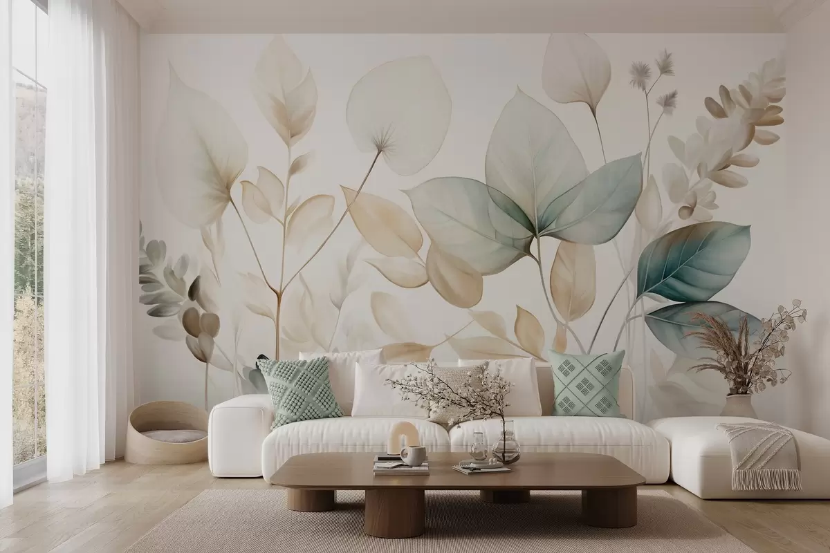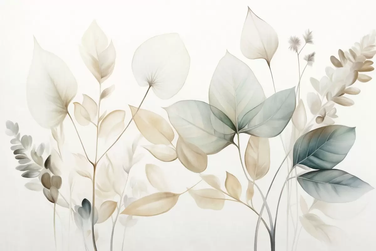 Fototapeta Teksturowane, półprzezroczyste liście w stonowanych odcieniach beżu i turkusu, z delikatnymi łodygami na miękkim, jasnym tle. Nr w09583
