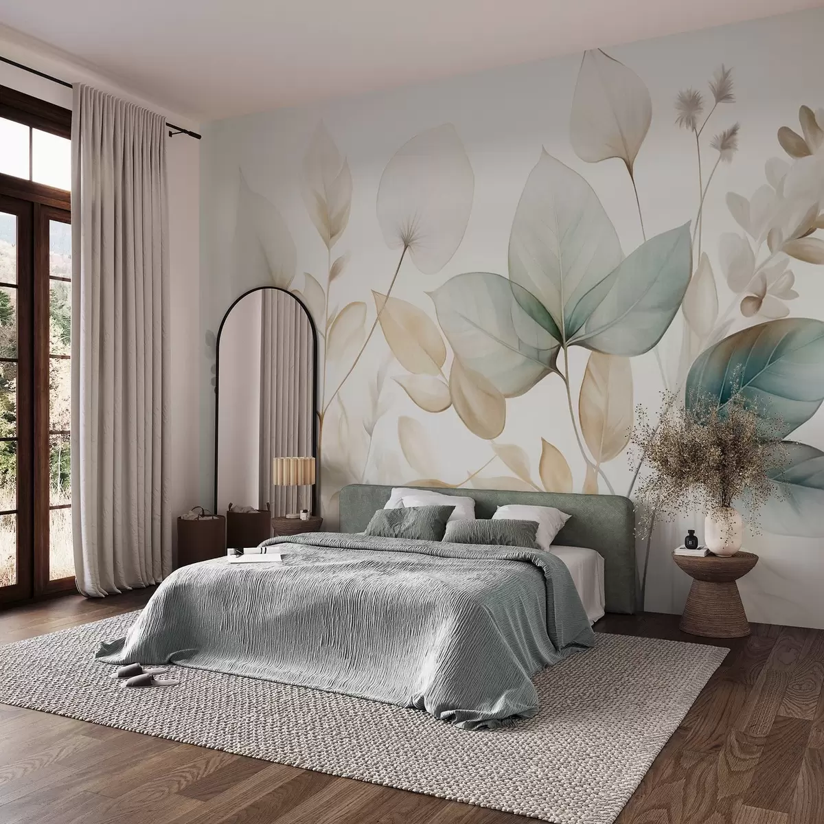 Fototapeta Teksturowane, półprzezroczyste liście w stonowanych odcieniach beżu i turkusu, z delikatnymi łodygami na miękkim, jasnym tle. Nr w09583