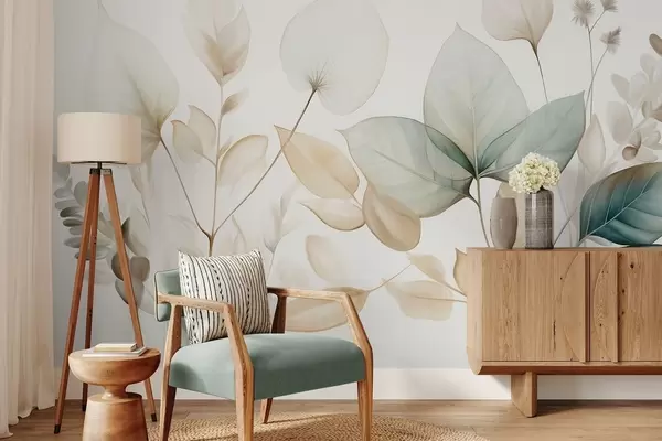 Fototapeta Teksturowane, półprzezroczyste liście w stonowanych odcieniach beżu i turkusu, z delikatnymi łodygami na miękkim, jasnym tle Nr w09583