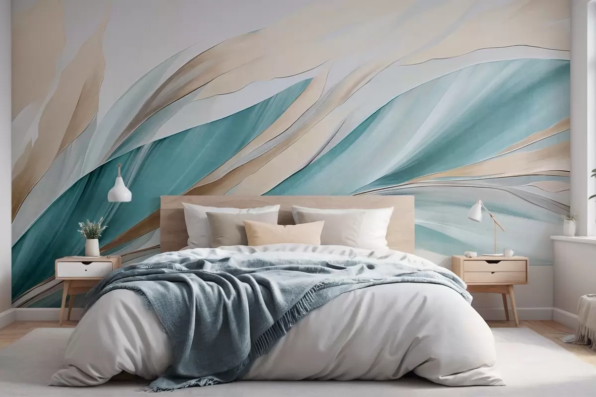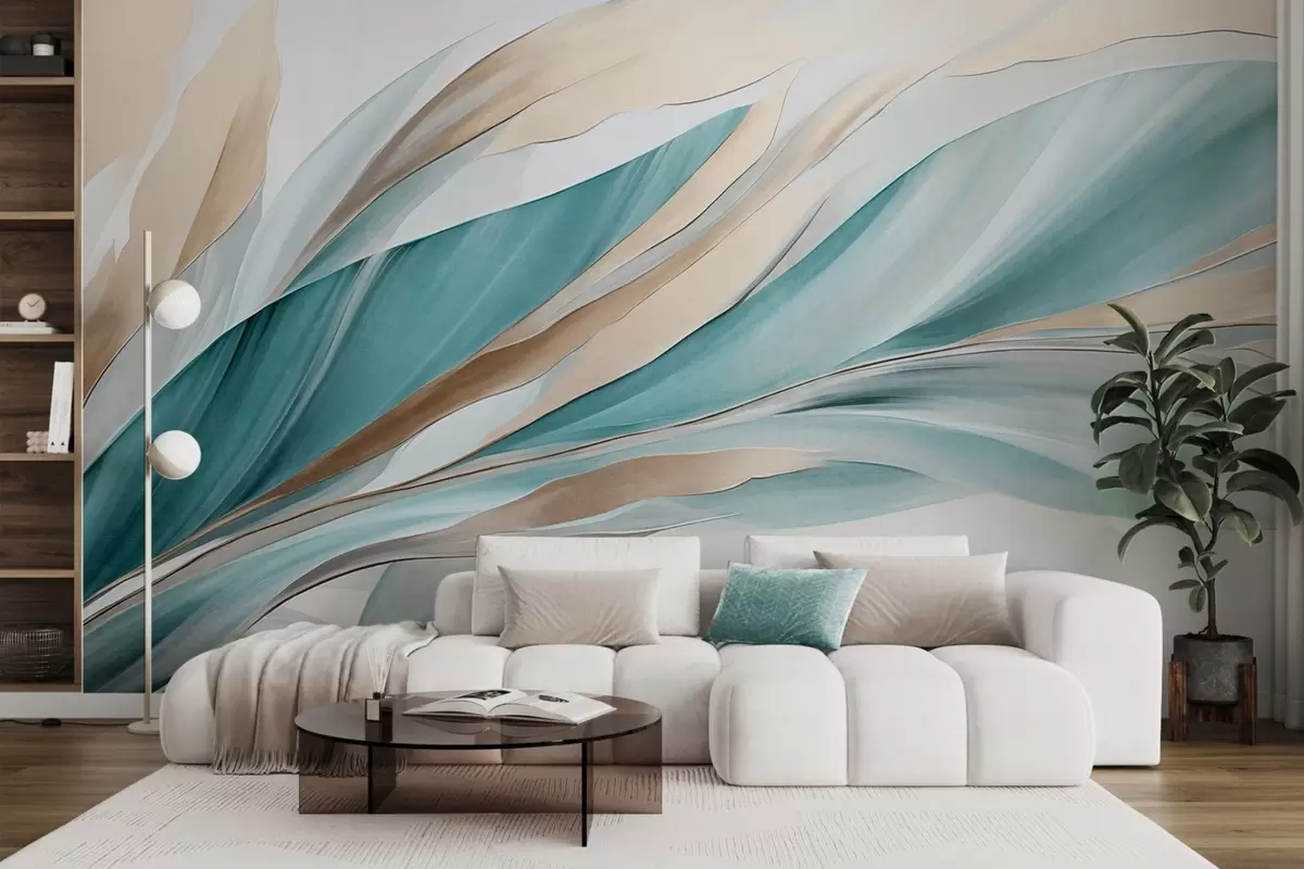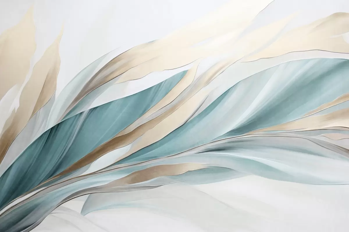 Fototapeta Abstrakcyjne, płynące fale w kolorze turkusowym i żółtym, z cienkimi kształtami i liniami, na białym tle, teksturowana grafika Nr w09585