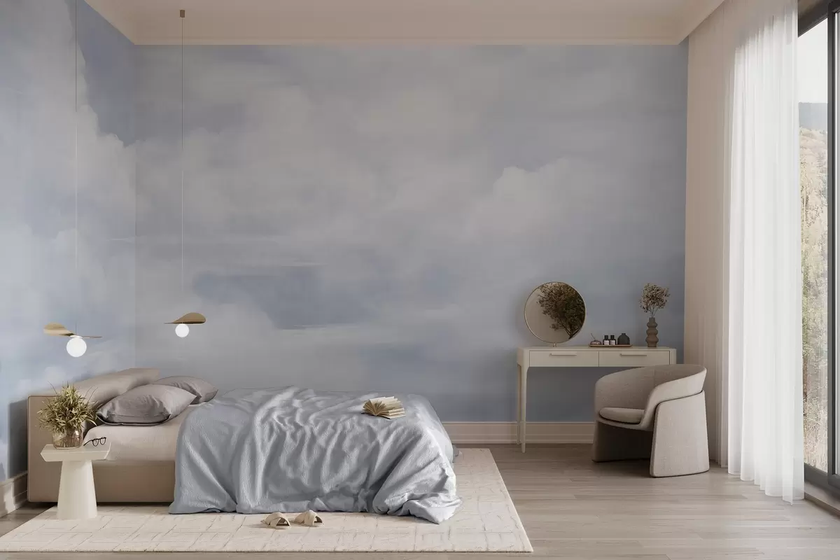 Fototapeta Pastelowe niebo o fakturze wypełnione białymi chmurami o delikatnej i minimalistycznej estetyce Nr w09589