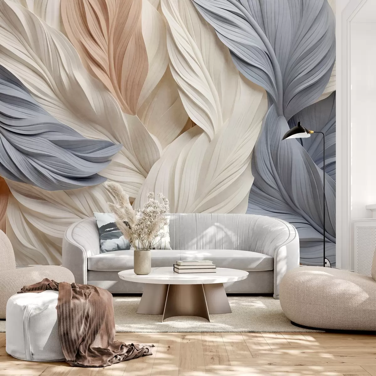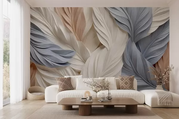Fototapeta Abstrakcyjne, warstwowe pióra w odcieniach kremowym, beżowym i jasnoniebieskim, o teksturowanym, organicznym wyglądzie. Nr w09603