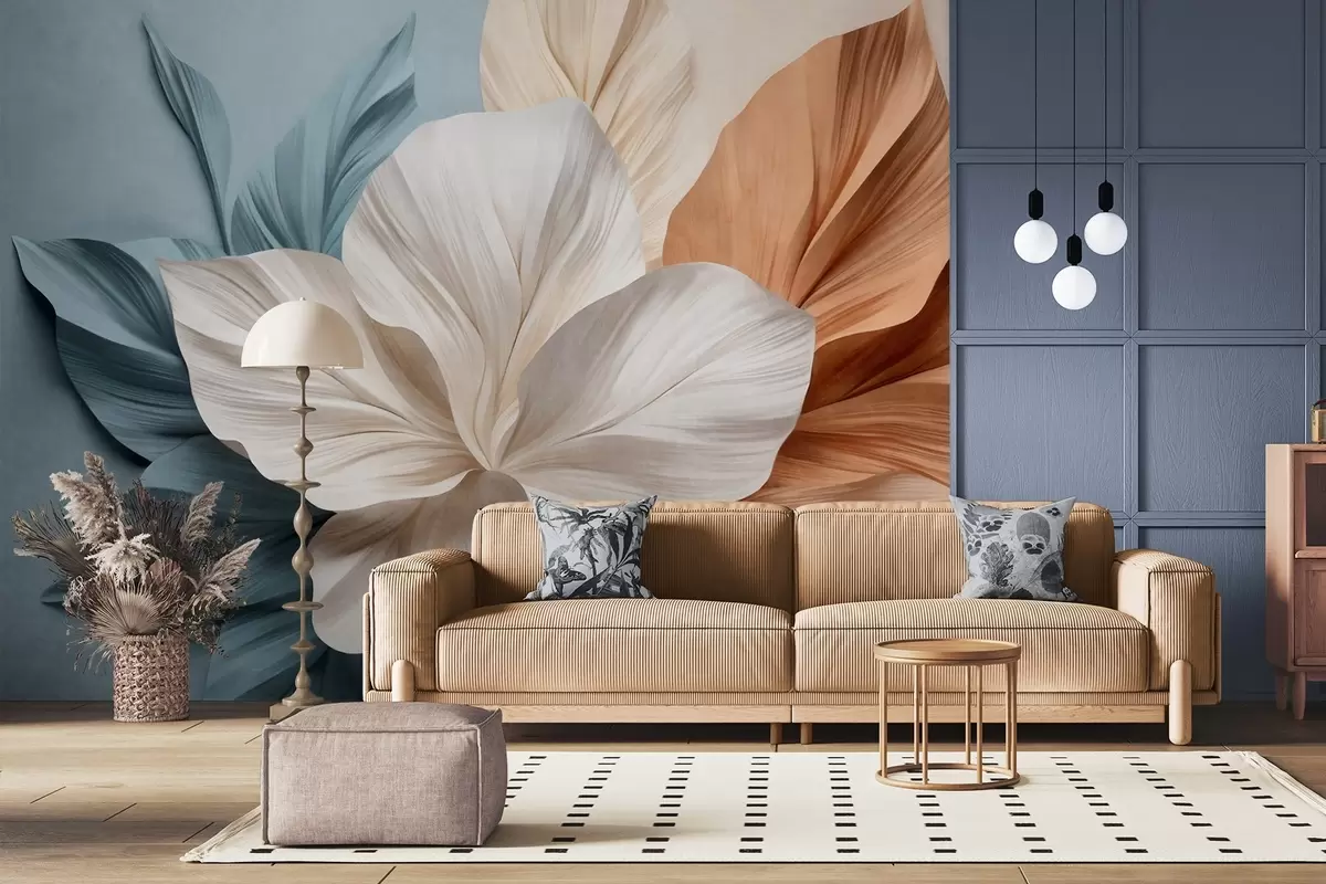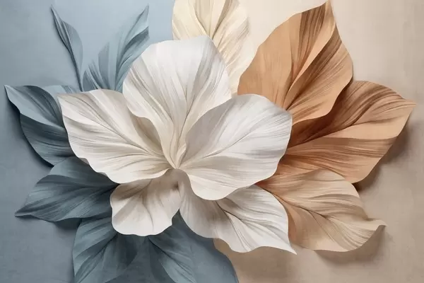 Fototapeta Abstrakcyjny kwiat o wielu płatkach z teksturowanymi liśćmi w odcieniach brzoskwini i błękitu, na delikatnym tle. Nr w09604
