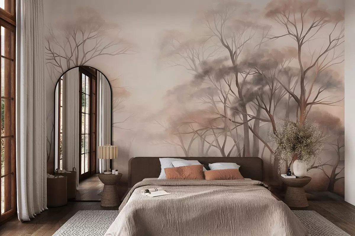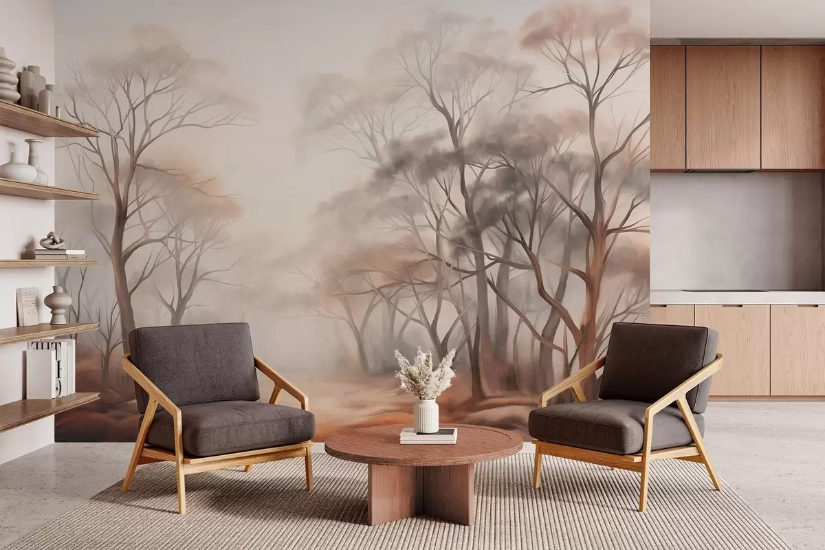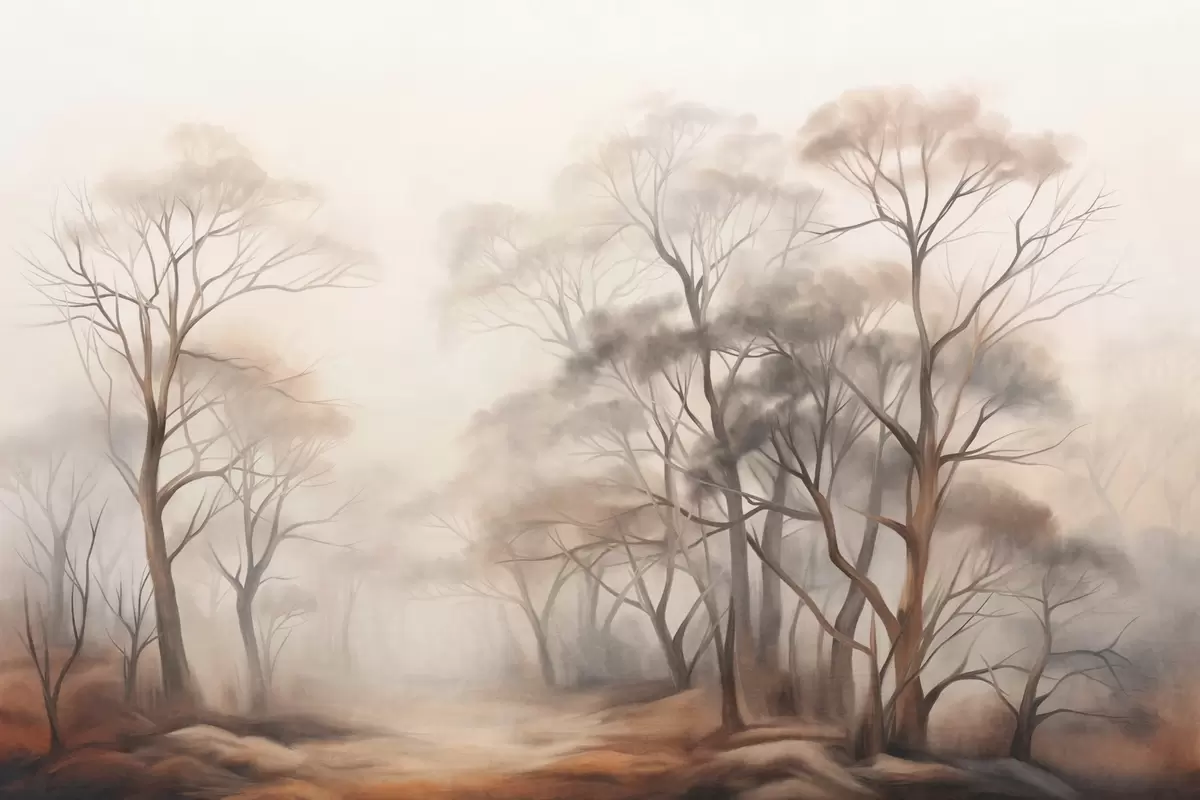 Fototapeta Teksturowane drzewa w zamglonym lesie, mglisty krajobraz o stonowanych, przytłumionych kolorach i delikatnym oświetleniu. Nr w09609