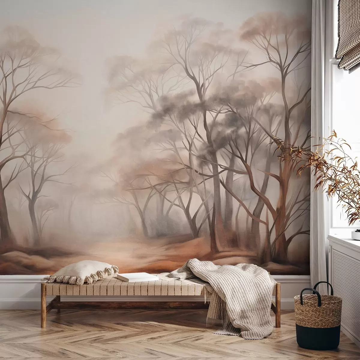 Fototapeta Teksturowane drzewa w zamglonym lesie, mglisty krajobraz o stonowanych, przytłumionych kolorach i delikatnym oświetleniu. Nr w09609