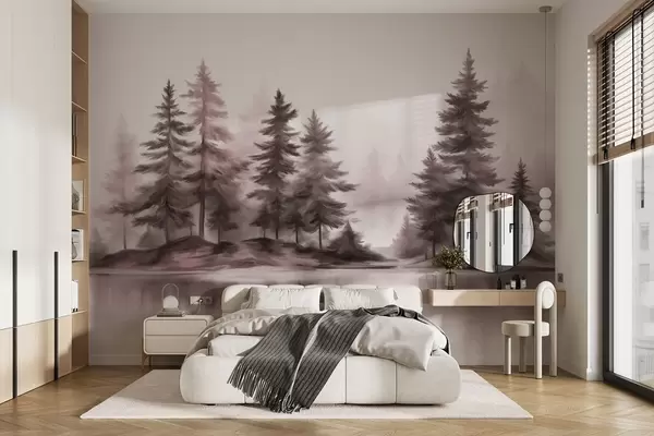 Fototapeta Teksturowany, zamglony las z wysokimi sosnami, imitacja obrazu Nr w09610v1