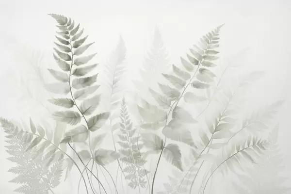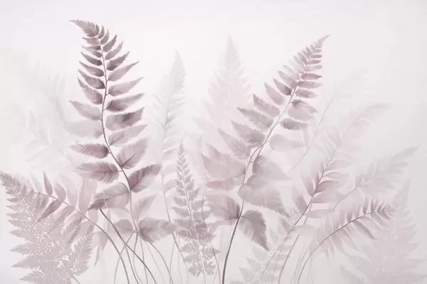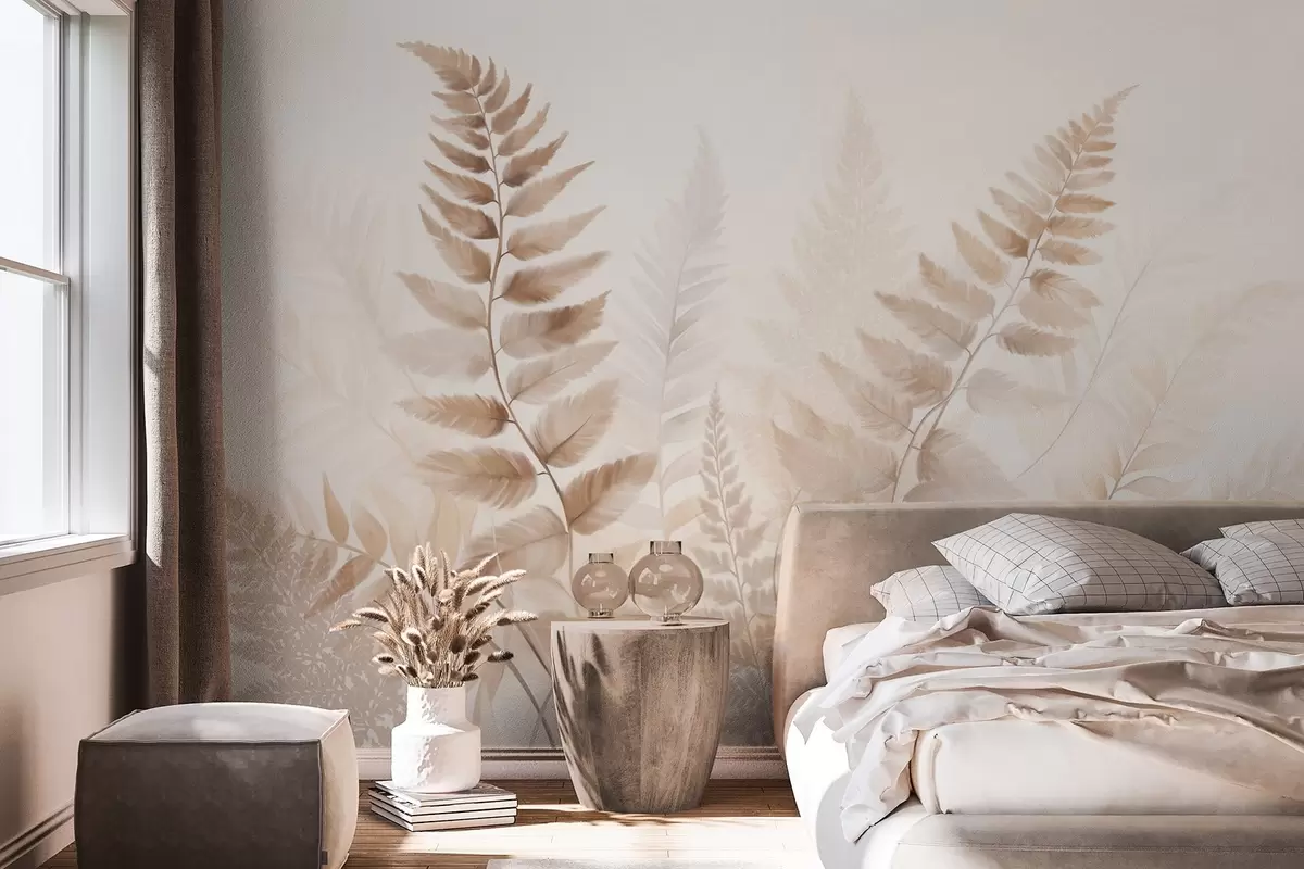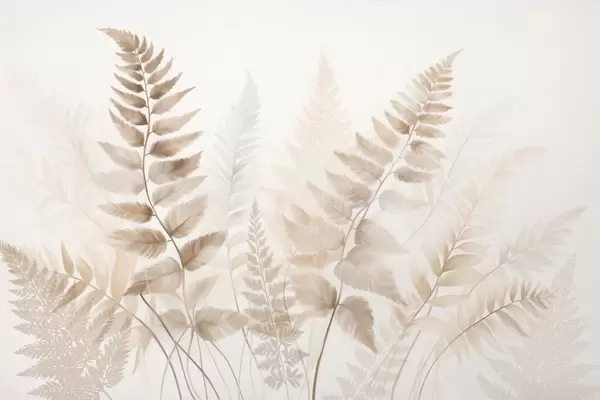 Fototapeta Teksturowane suszone liście paproci w różnych odcieniach brązu, na delikatnym, jasnym tle w stylu akwareli. Nr w09615