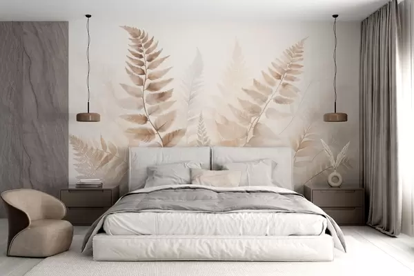 Fototapeta Teksturowane suszone liście paproci w różnych odcieniach brązu, na delikatnym, jasnym tle w stylu akwareli. Nr w09615